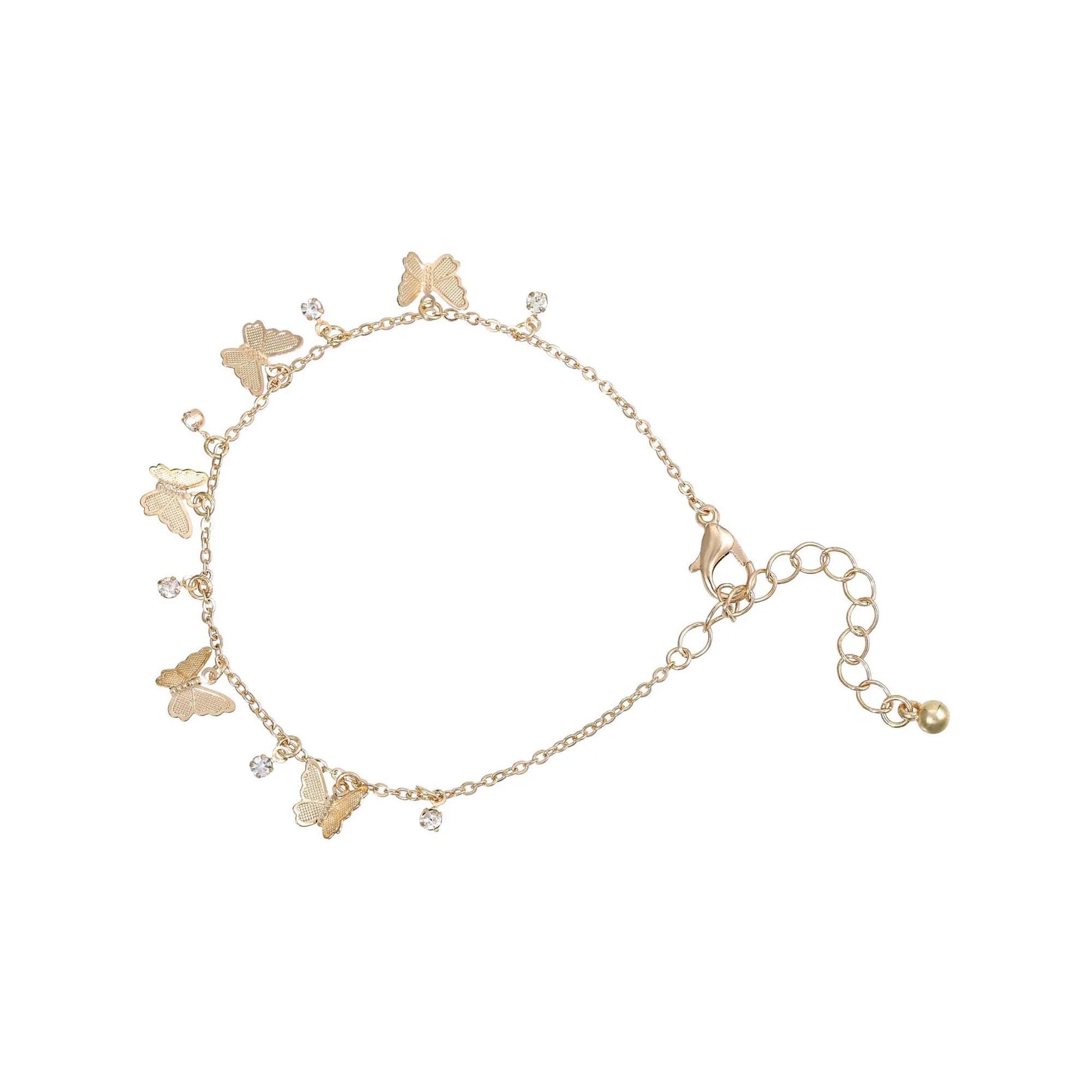 Il bracciale - Springtime Bliss brilla di colore oro ed è decorato con cinque piccoli ciondoli a forma di farfalla e sei piccoli strass. Il bracciale ha una catenina di estensione.