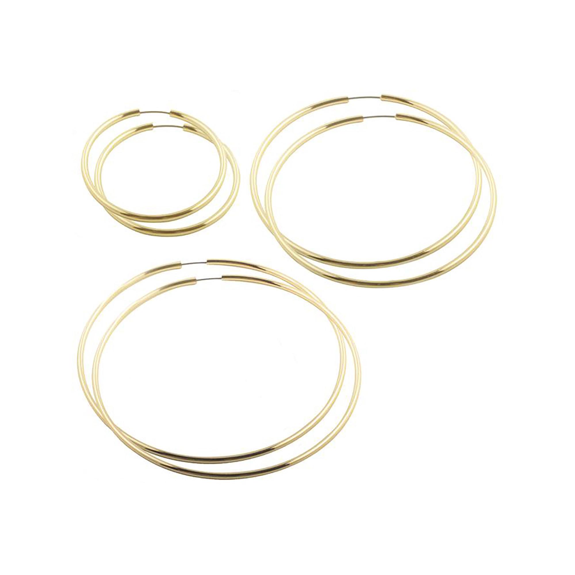 Questo set di tre paia di creoli in metallo dorato di diverse dimensioni è versatile e senza tempo. Con diametri di 4 cm, 6,5 cm e 8,5 cm, è facile creare look eleganti.