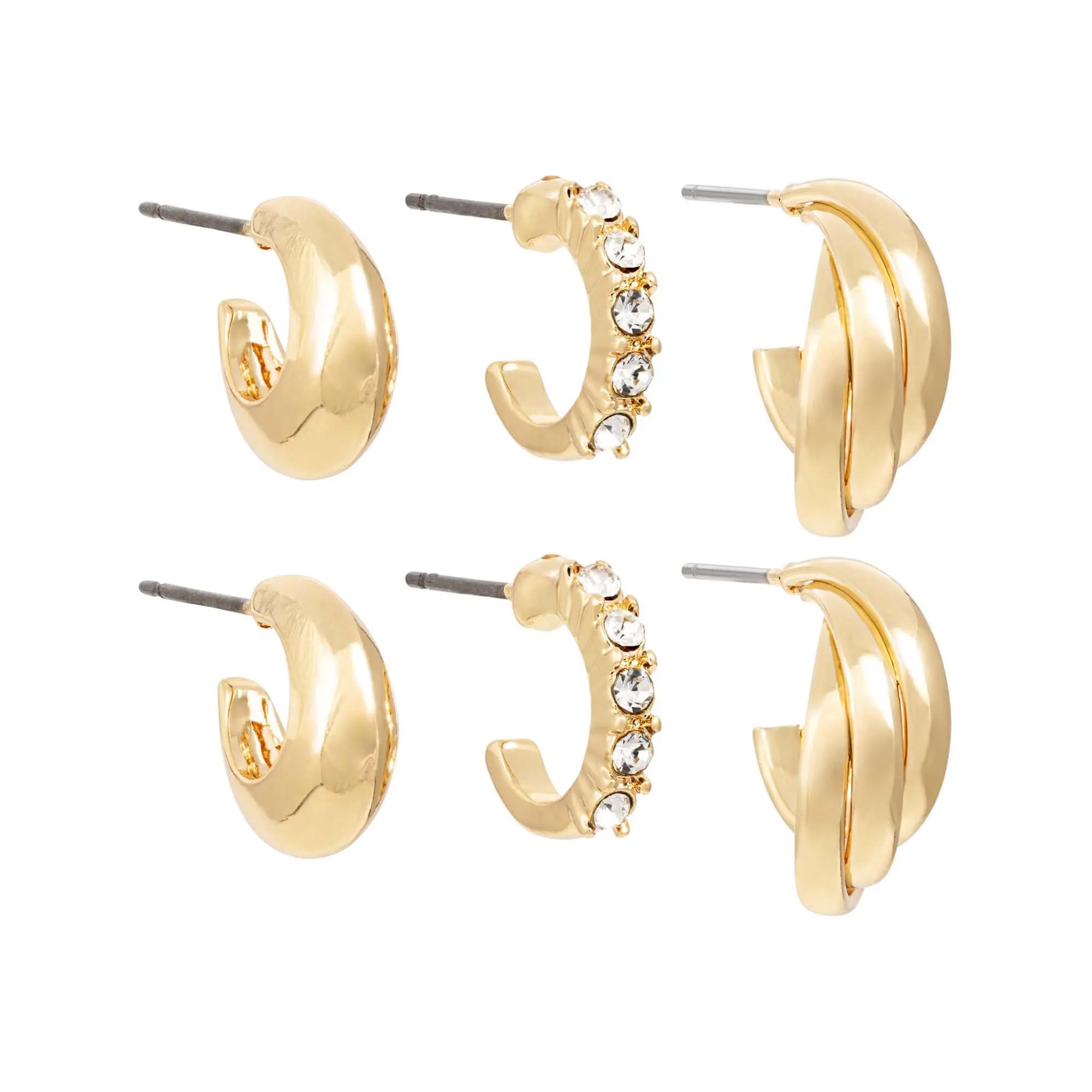 Il set di creole - Golden Variety è dorato e comprende tre paia di creole con design differenti. Un paio è semplice e spesso, un altro è decorato con scintillanti strass, mentre il terzo paio ha una struttura incrociata marcata a tre livelli. Ideale per essere combinato o indossato singolarmente – la dichiarazione perfetta per ogni occasione.