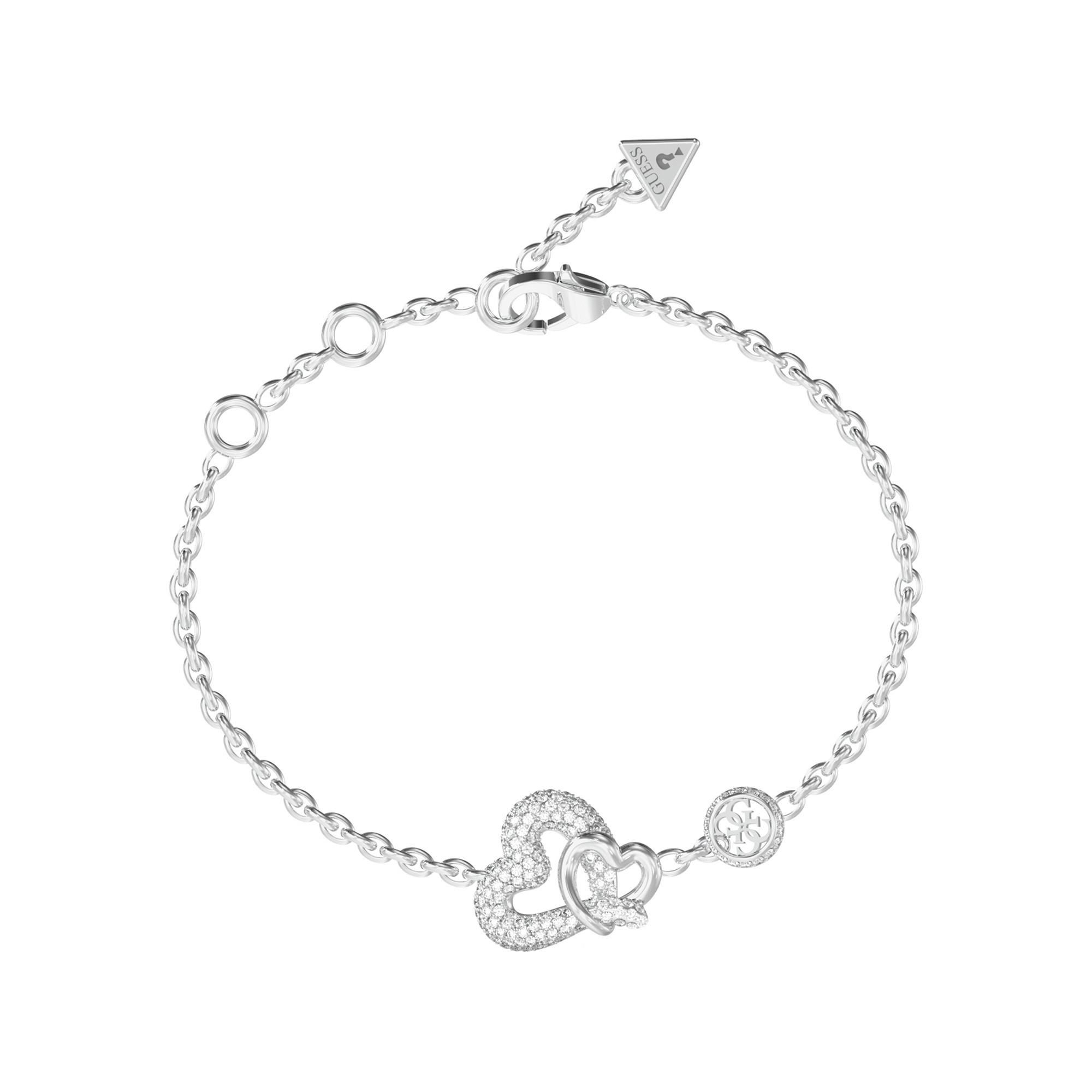 Questo bracciale elegante in acciaio inossidabile colpisce per la catena sottile e il motivo a cuore con elementi intrecciati. Le pietre in zirconia cubica aggiungono una brillantezza raffinata e moderna. La lunghezza regolabile e la chiusura a moschettone assicurano una vestibilità confortevole.