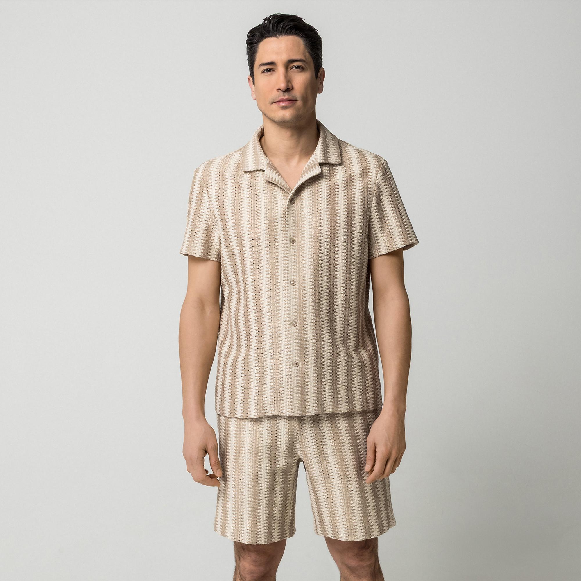 Questa camicia a maniche corte presenta un colletto classico e un'abbottonatura a tutta lunghezza, offrendo un look intramontabile e versatile. Il tessuto testurizzato aggiunge un tocco di raffinatezza al design.