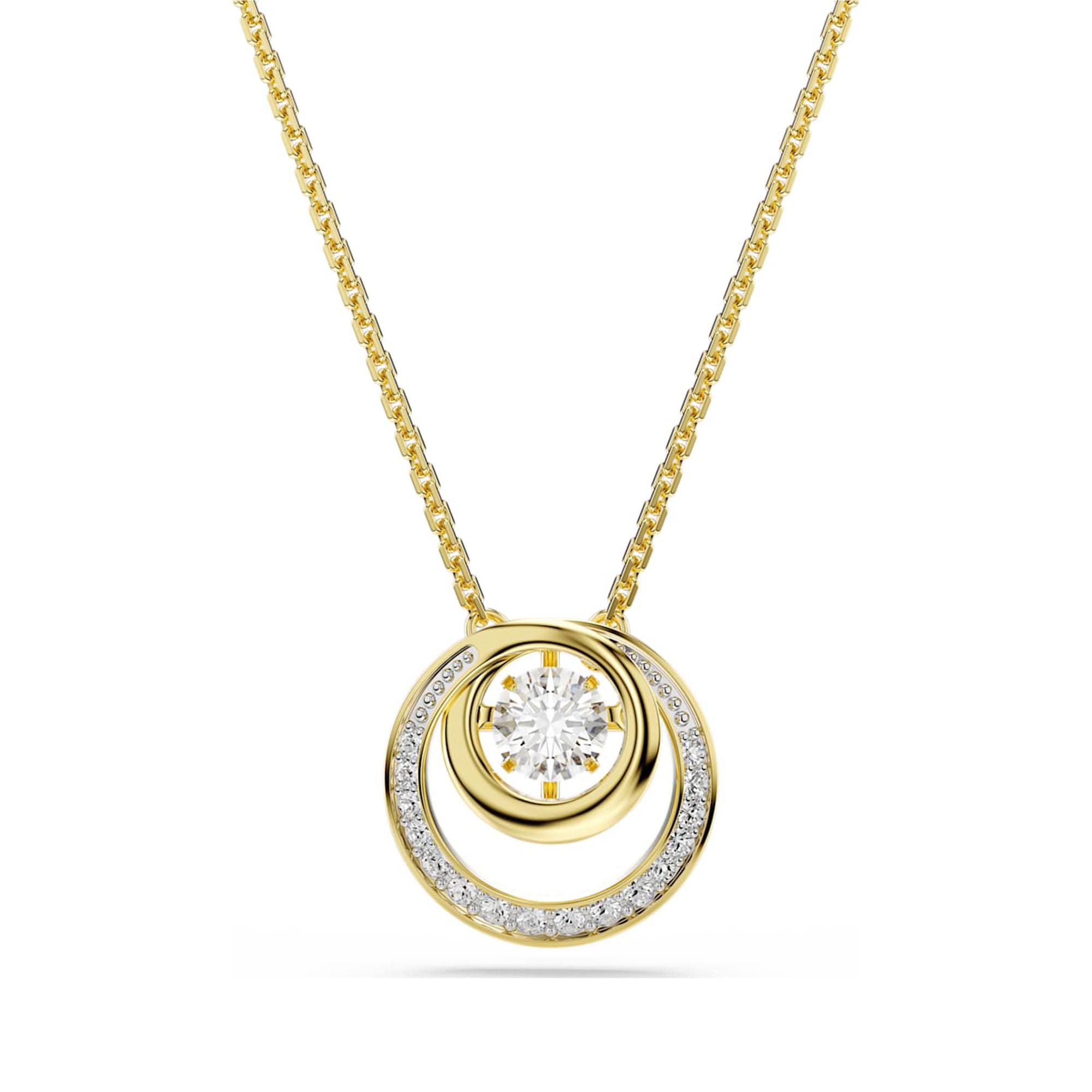 Questa collana Hyperbola sfuma i confini tra stile classico e contemporaneo e presenta una silhouette di gioiello unica. Il design circolare con finitura in lega dorata presenta una Dancing Stone centrale, incorniciata da cristalli di diverse dimensioni. Indossate questa creazione con gli orecchini coordinati o un anello per enfatizzare il look quasi ipnotico.
