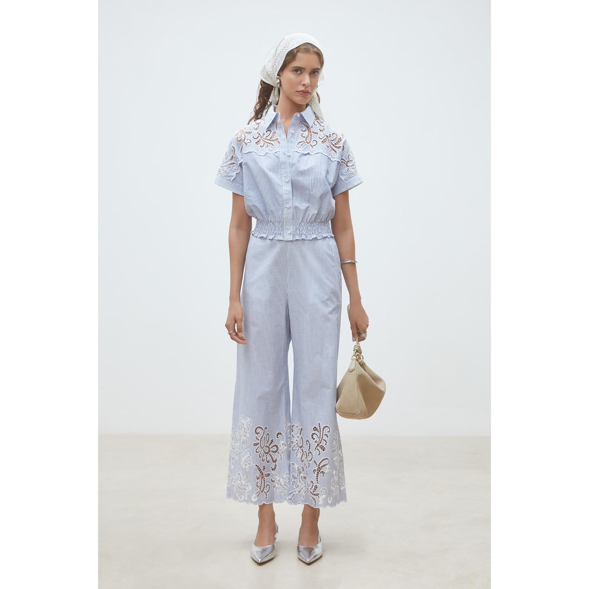Questi pantaloni presentano un motivo a righe e una silhouette a gamba larga, offrendo un look rilassato ma elegante. Il design è arricchito da un delicato bordo in pizzo sull'orlo, che aggiunge un tocco di eleganza. Un elastico in vita assicura una vestibilità confortevole.
