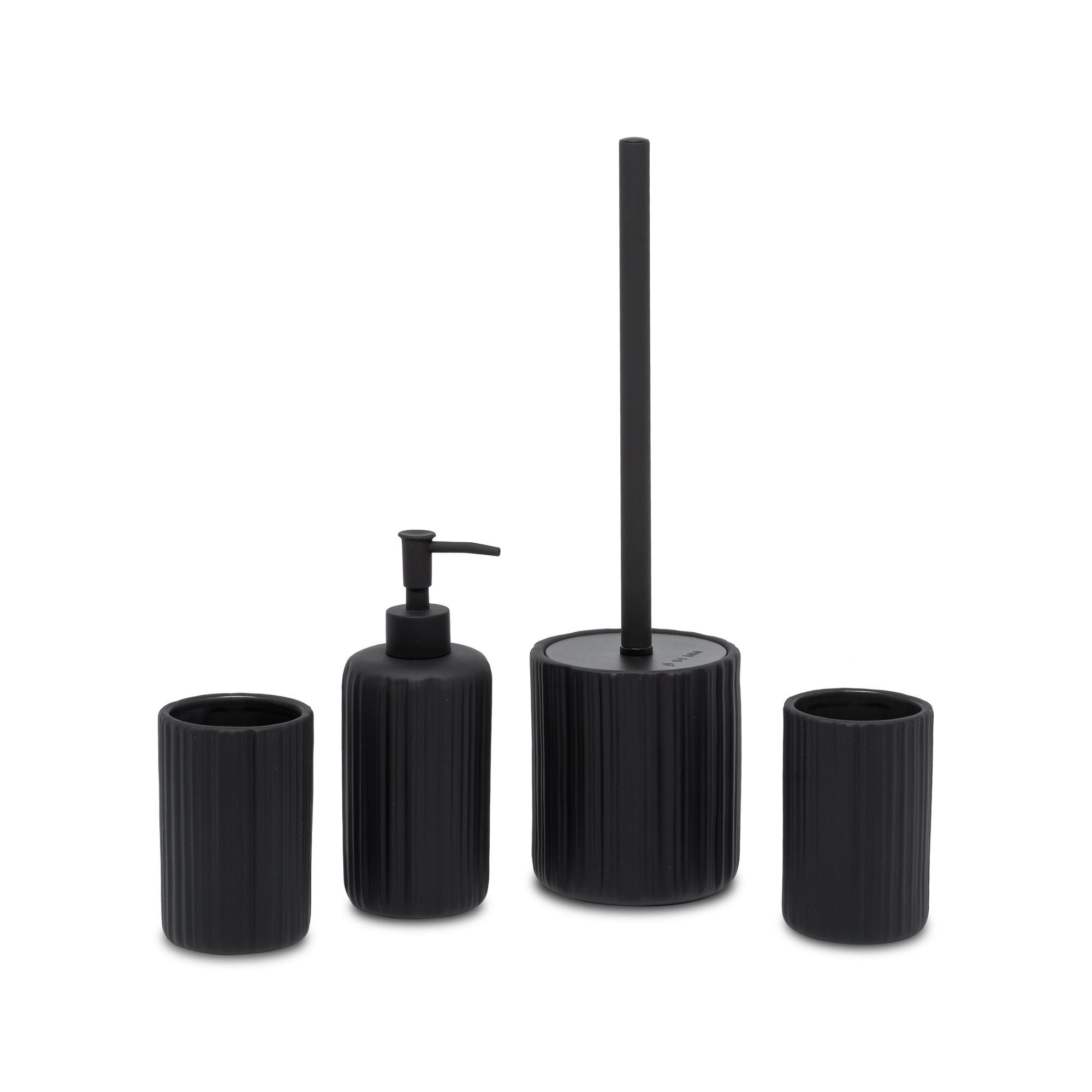 Questo set da bagno firmato Manor è composto da due tazze portaspazzolino, un dispenser di sapone e un set di spazzole per WC. Il design monocromatico e scanalato è di tendenza. Gli accessori da bagno sono realizzati in ceramica.