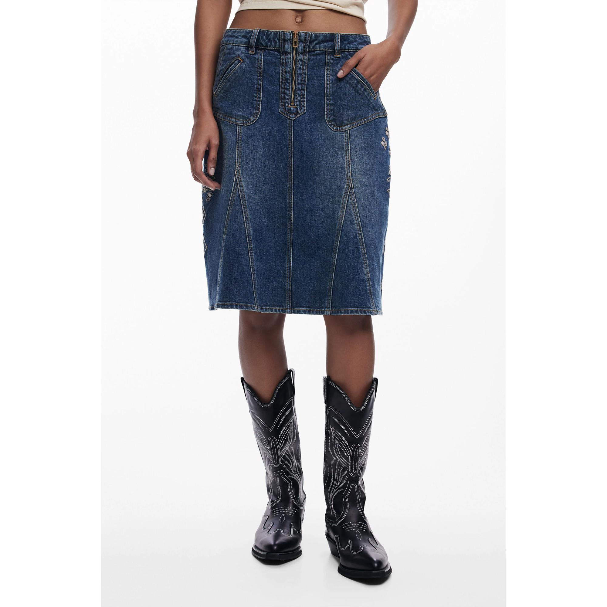 Questa gonna in denim presenta una silhouette svasata lusinghiera e una vestibilità comoda. Il design include cuciture decorative e sottili abbellimenti, che aggiungono un tocco di stile unico. È un capo versatile che può essere indossato in modo elegante o casual per varie occasioni.