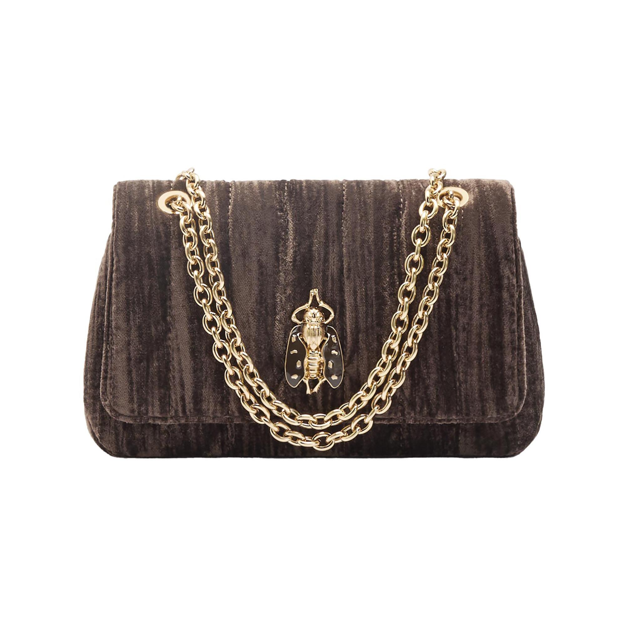 Questa elegante borsa a mano presenta una lussuosa texture simile al velluto e un design sofisticato. È adornata con un distintivo abbellimento a forma di ape sulla patta anteriore, aggiungendo un tocco unico ed elegante. La borsa è completata da una tracolla a catena chic, che consente opzioni di trasporto versatili.
