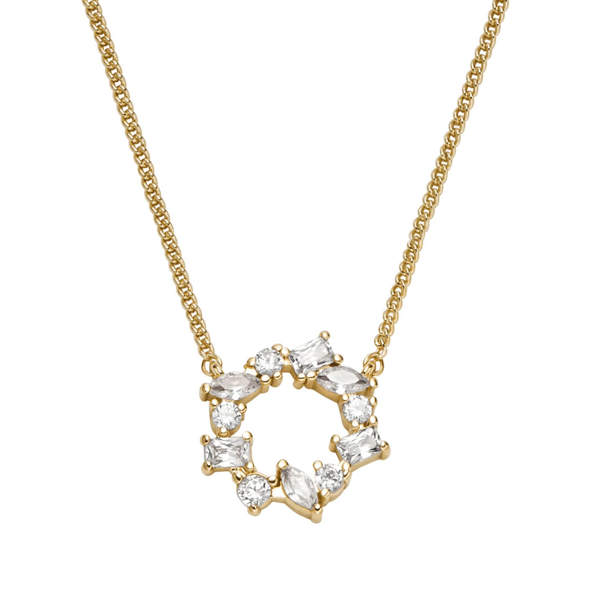 Questa collezione mostra un arrangiamento artistico di forme geometriche miste, che conferiscono dimensione alla silhouette minimalista. La sottile catena in metallo dorato lucido è dotata di un moschettone, che garantisce una vestibilità sicura e regolabile.