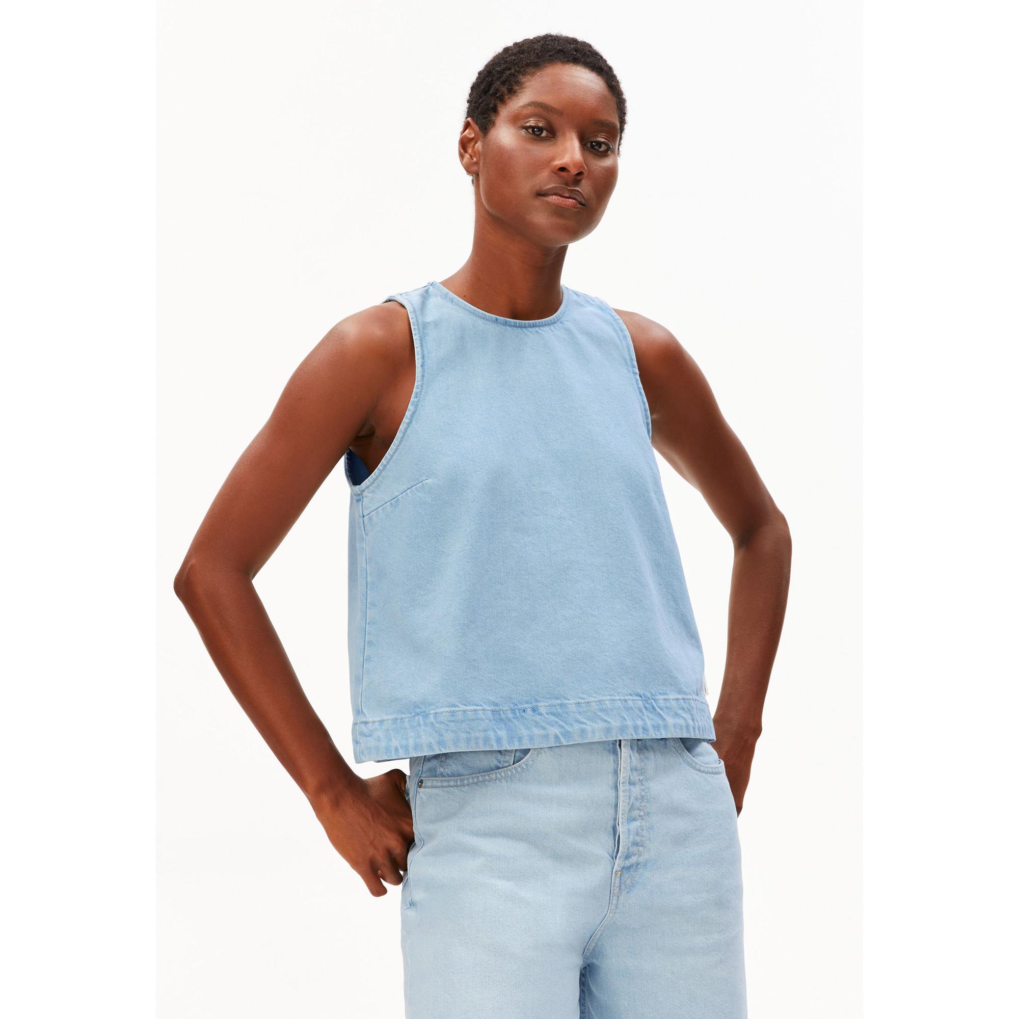 Questo top in denim senza maniche è un'aggiunta versatile a qualsiasi guardaroba. Il suo design classico e la vestibilità comoda lo rendono adatto a varie occasioni, offrendo un look intramontabile ma alla moda.