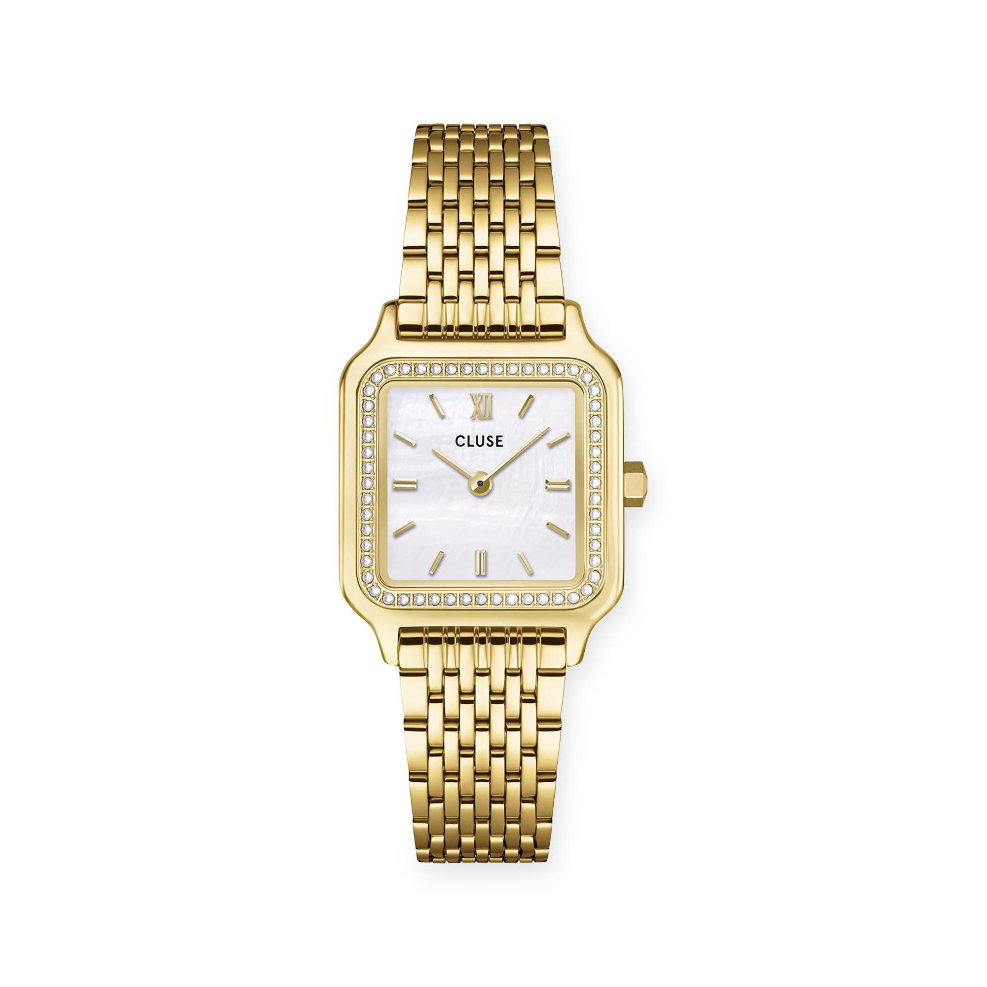 L’orologio Gracieuse Petite conquista con la sua cassa quadrata da 24 mm in tonalità oro e una lunetta impreziosita da perle di vetro scintillanti. Il quadrante in madreperla bianca dona un carattere raffinato e femminile, mentre il bracciale in acciaio inox dorato completa il look con eleganza moderna. Grazie al sistema di aggancio semplice, l’orologio può essere personalizzato con qualsiasi cinturino CLUSE da 14 mm.