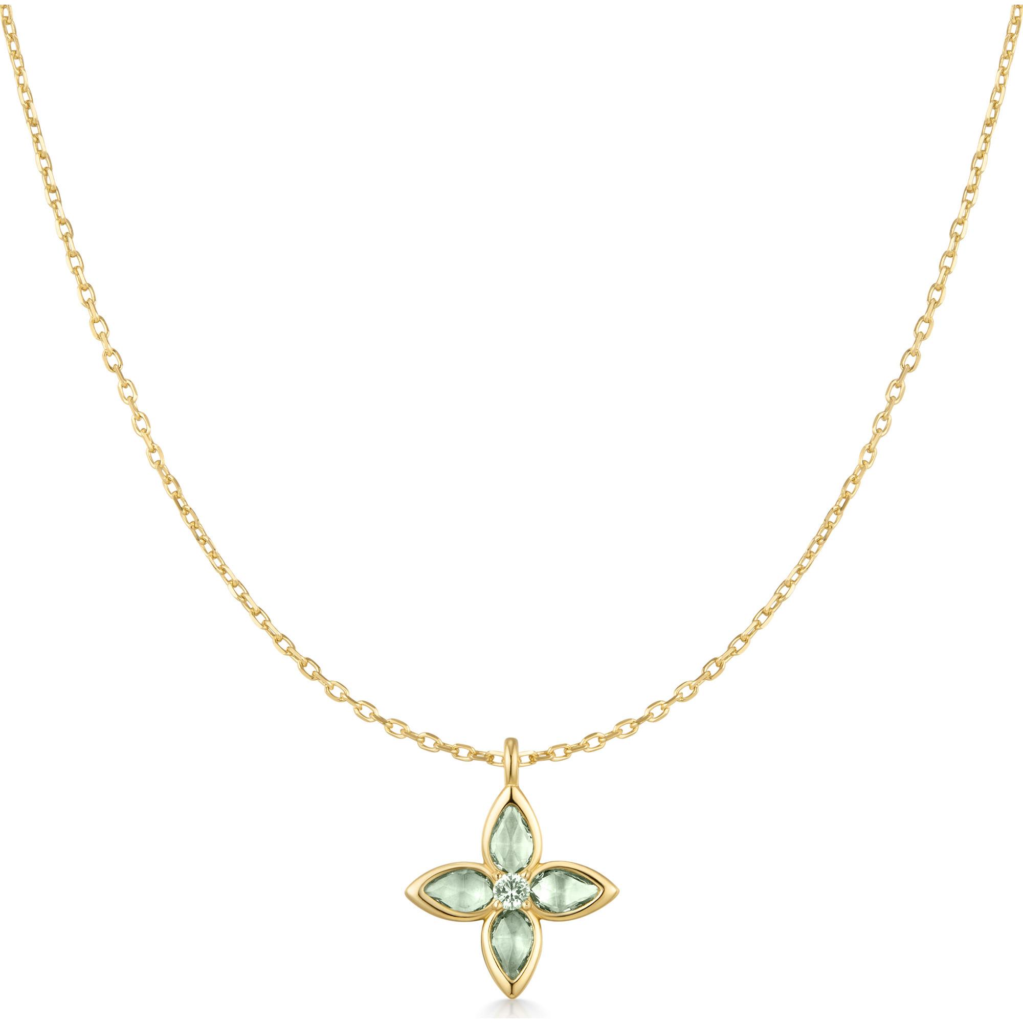 Questa collana delicata dall’aspetto dorato colpisce per la catena sottile e il ciondolo decorativo a forma di croce floreale. Le pietre decorative verdi dai riflessi delicati aggiungono un tocco di freschezza e un’eleganza moderna al design. Un gioiello versatile, perfetto da indossare ogni giorno o nelle occasioni speciali.