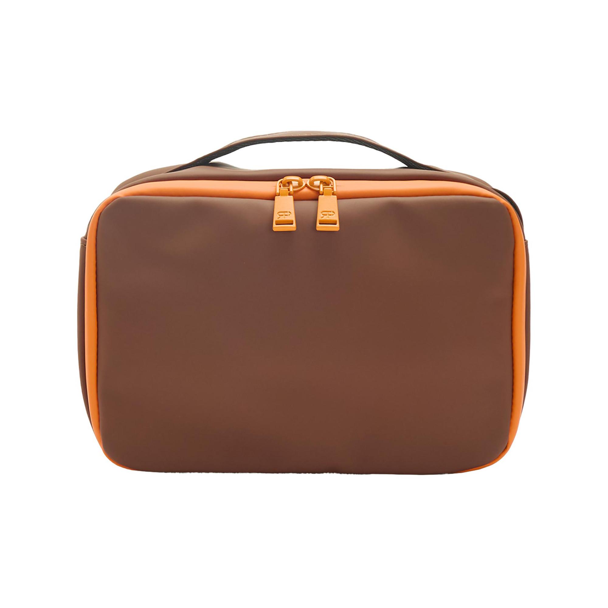 Necessaire liscio dalla texture morbida con appendiabiti. Fodera interna in colore a contrasto. Tasche interne in rete. Chiusura con cerniera. Manico rigido.