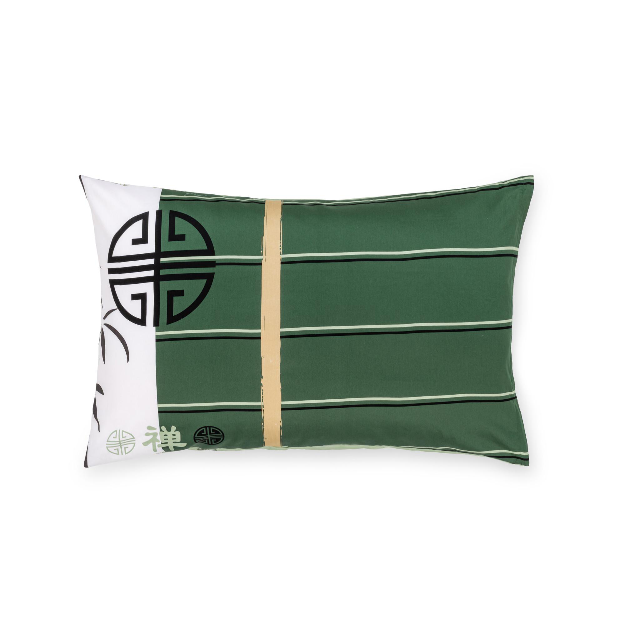 Questa federa presenta un design grafico unico, che combina motivi tradizionali con un'estetica moderna. Un lato mostra un audace motivo geometrico in bianco e nero su uno sfondo verde, accentuato da strisce orizzontali. Il lato posteriore presenta un sereno design a foglie di bambù su uno sfondo verde più chiaro, offrendo versatilità nello stile.