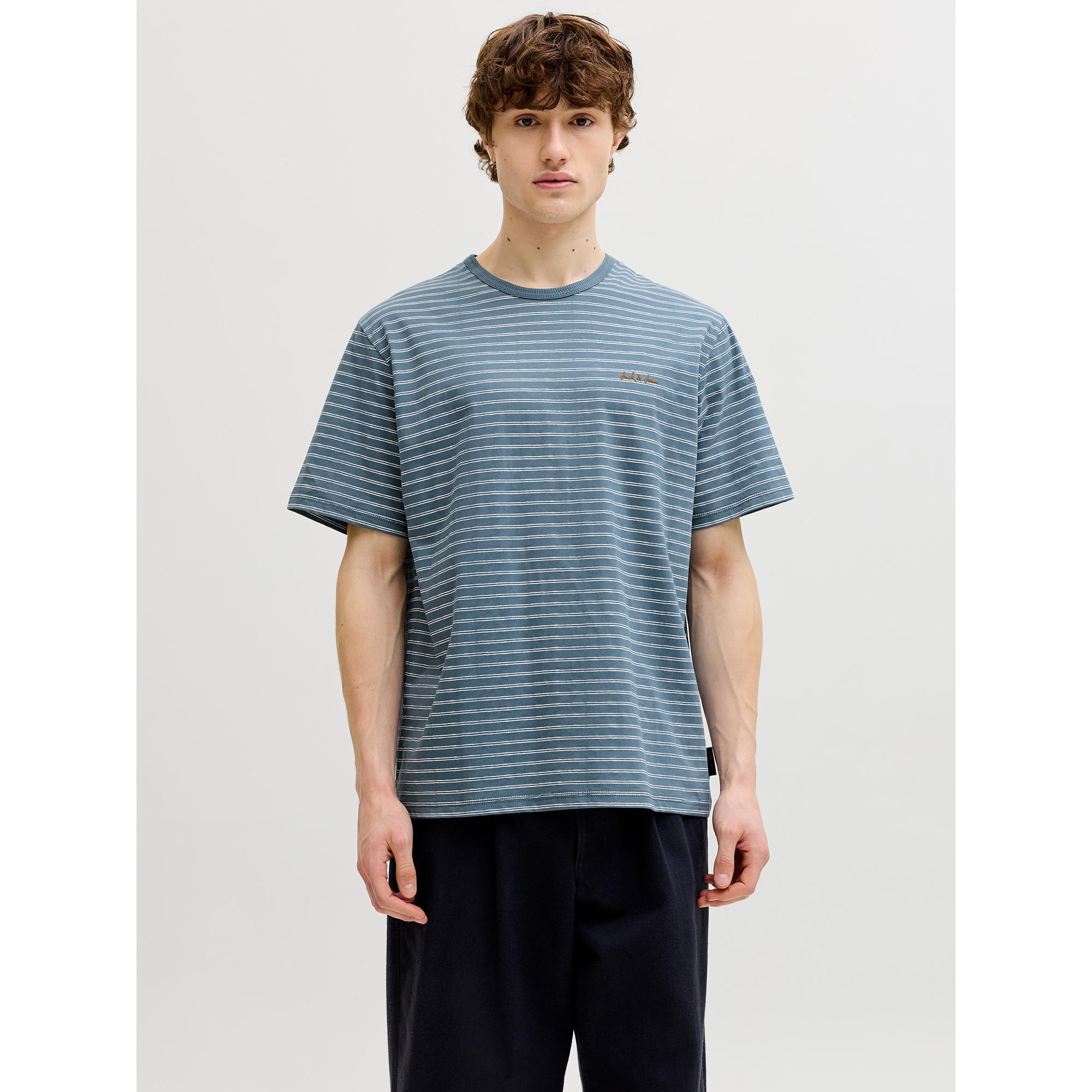 Questa T-shirt a maniche corte presenta un classico girocollo e un motivo a righe su tutta la superficie. Il design include un piccolo dettaglio ricamato sul petto, che aggiunge un sottile tocco di stile. È un capo versatile adatto a diverse occasioni casual.