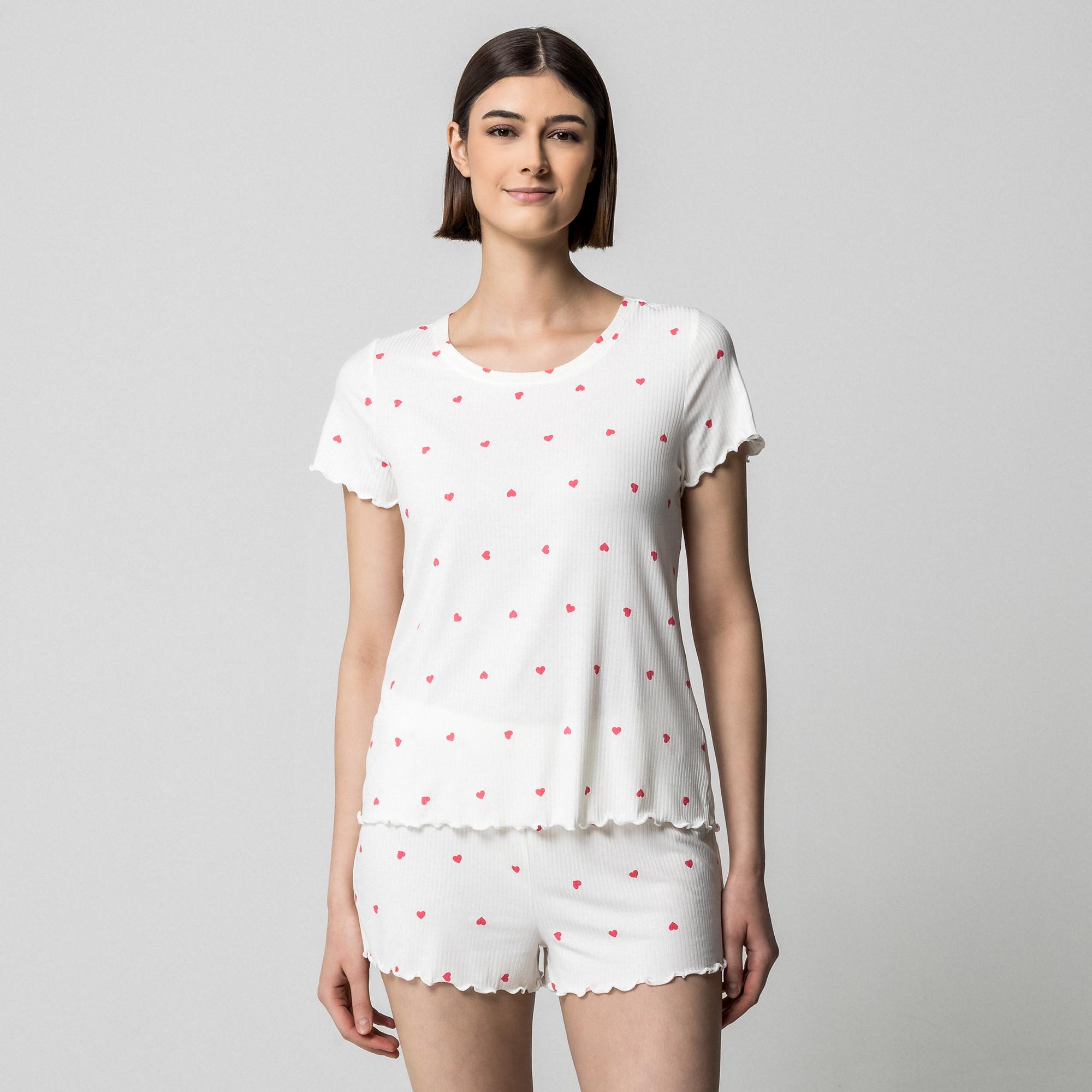 Questo affascinante set pigiama con una giocosa stampa a cuori offre un'opzione deliziosa e confortevole per l'abbigliamento da casa o da notte. Il set include un top a maniche corte e pantaloncini abbinati, entrambi progettati per una vestibilità rilassata.