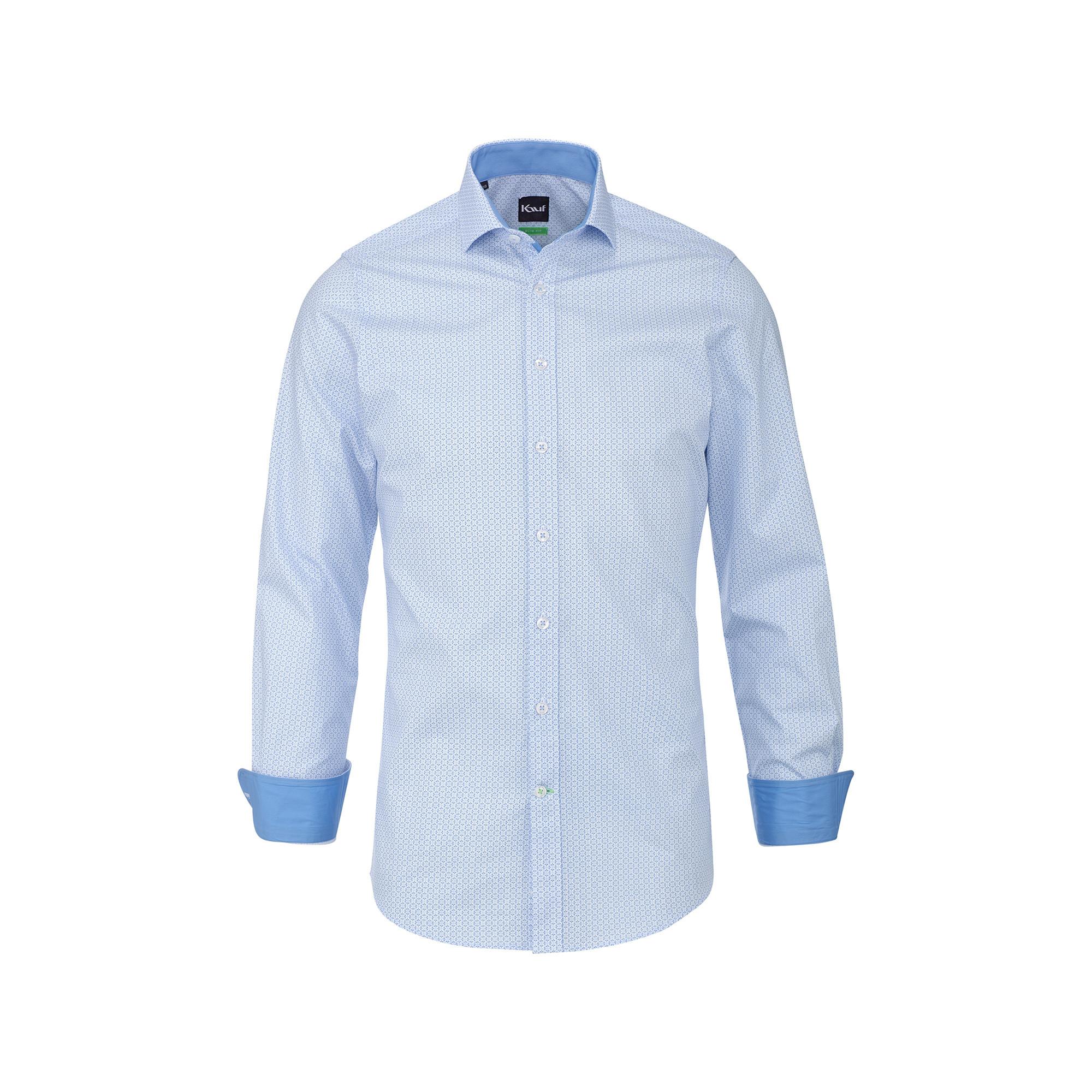 La nostra camicia London New Kent con contrasto ha una vestibilità slim fit con taglio fortemente sciancrato ed è realizzata in cotone 100% raffinato nella comprovata qualità KAUF. La camicia da uomo con stampa tono su tono in azzurro è un ottimo accessorio da abbinare ai jeans ma anche ai pantaloni chino. Nel nostro negozio è uno dei capi indispensabili che valorizza il guardaroba di ogni uomo. Grazie al cotone pregiato che non necessita di stiratura, la camicia London New Kent slim fit è particolarmente leggera e comoda da indossare e rimane a lungo senza pieghe.