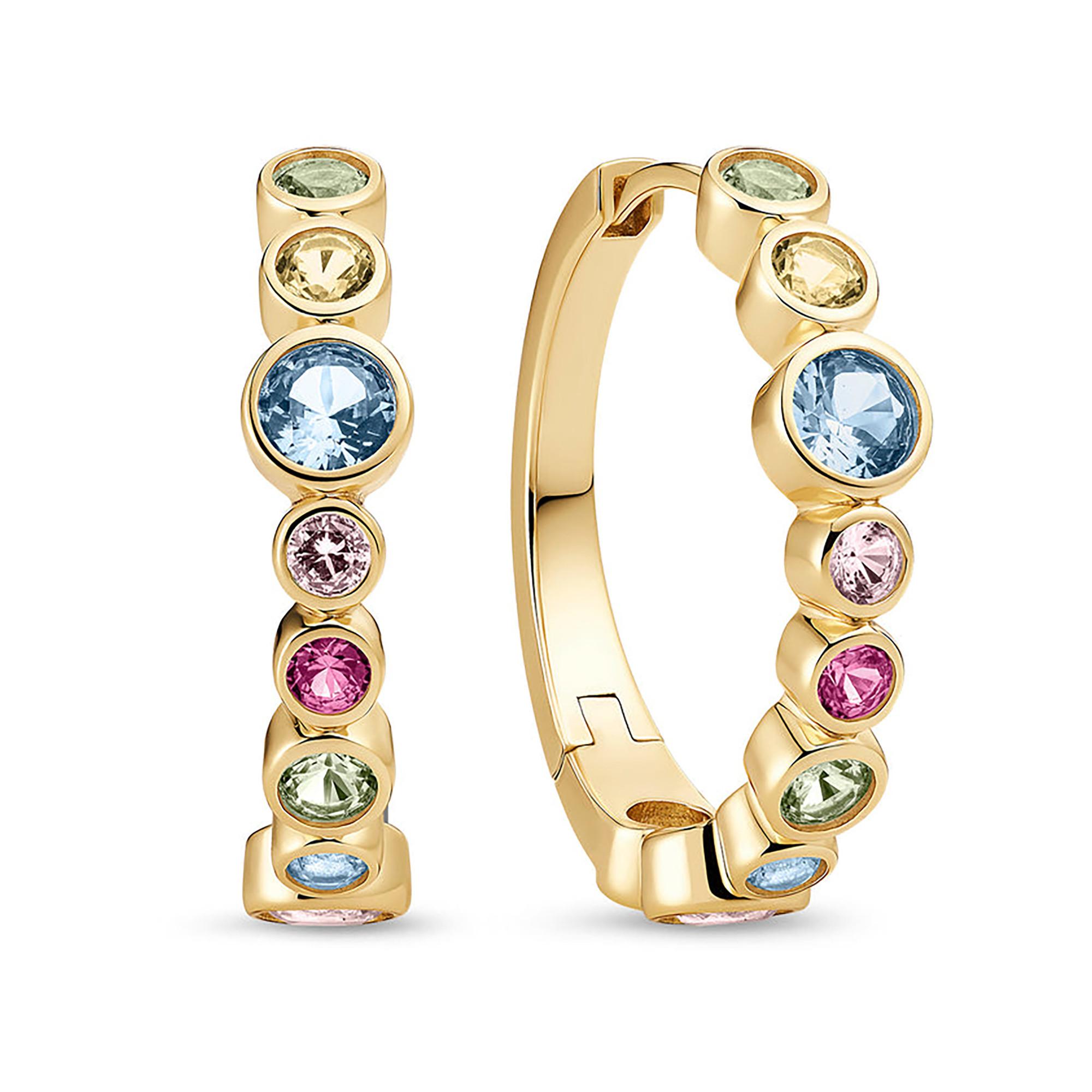 Questi eleganti orecchini in argento sterling 925 con placcatura in oro 18 carati si distinguono per la superficie lucidata e gli zirconi multicolore sfaccettati incastonati a mano. La placcatura di alta qualità dona al gioiello una luminosità calda e valorizza le sfumature di colore. Il diametro equilibrato aggiunge un accento raffinato, ideale sia per look quotidiani che per occasioni speciali.
