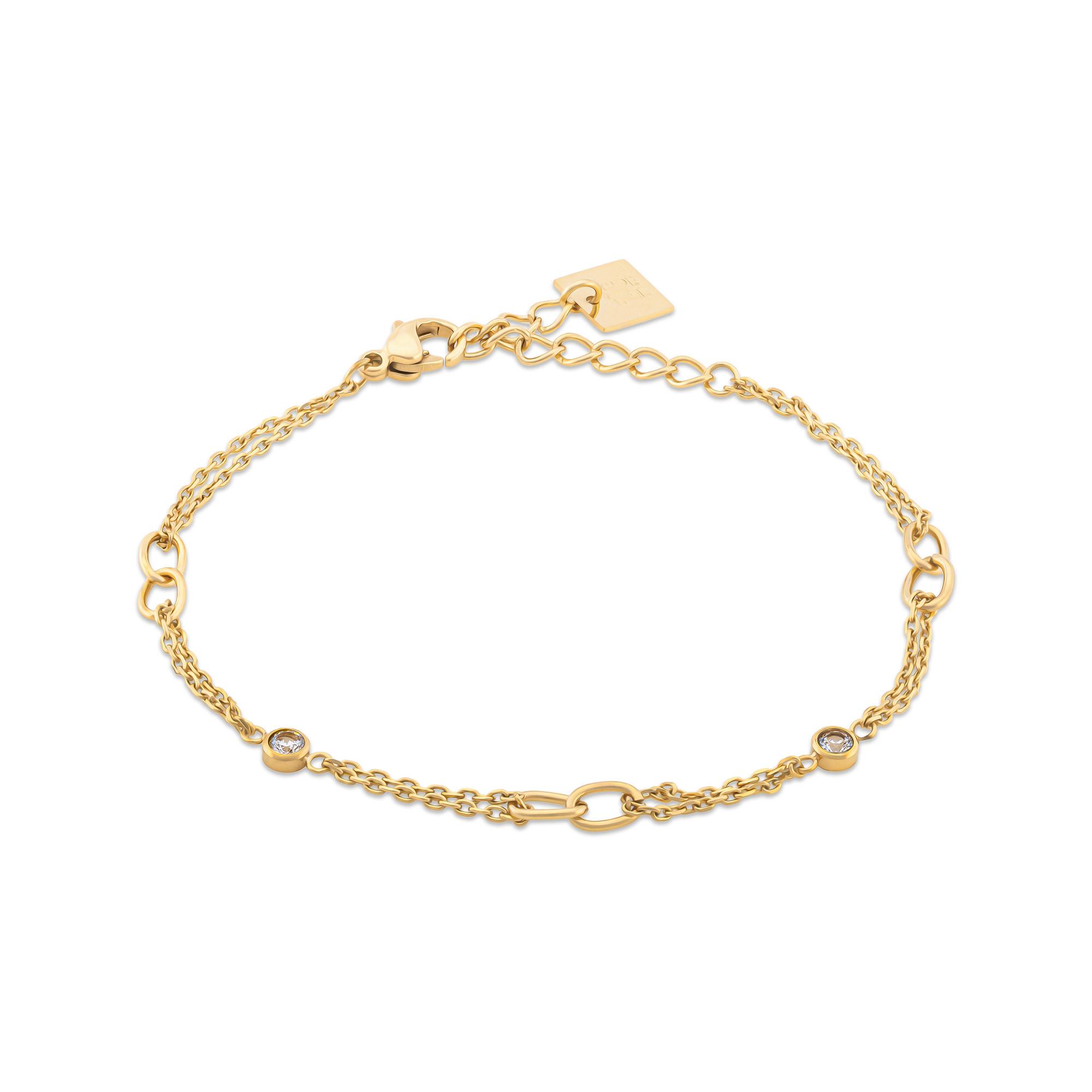 Questo delicato bracciale firmato Zag Bijoux è un gioiello raffinato dal fascino allegro. La catenina è realizzata in acciaio inossidabile color oro e pietre ornamentali sfaccettate. Può essere chiusa con una chiusura a moschettone.