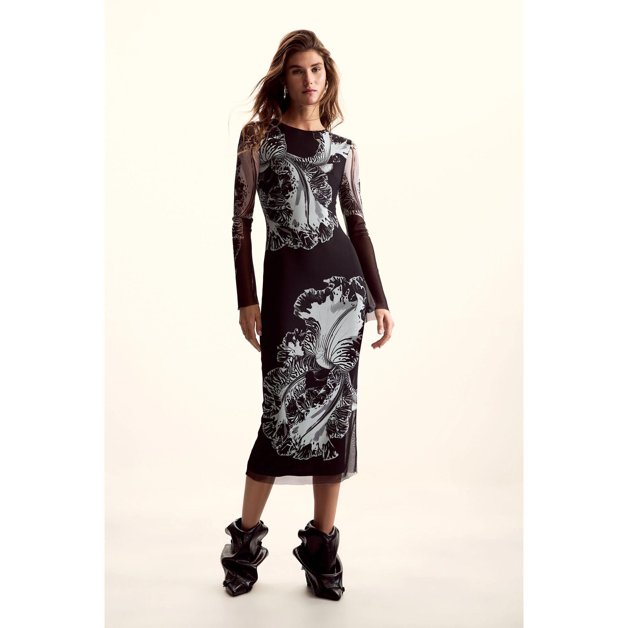 Questo abito midi a maniche lunghe presenta una stampa sorprendente che combina elementi astratti e floreali nelle tonalità del nero, bianco e grigio. L'abito ha uno scollo rotondo e maniche lunghe con un polsino leggermente svasato, offrendo una silhouette sofisticata. Il corpo dell'abito è aderente, si estende fino a una lunghezza midi ed è progettato per creare un look visivamente accattivante e moderno.