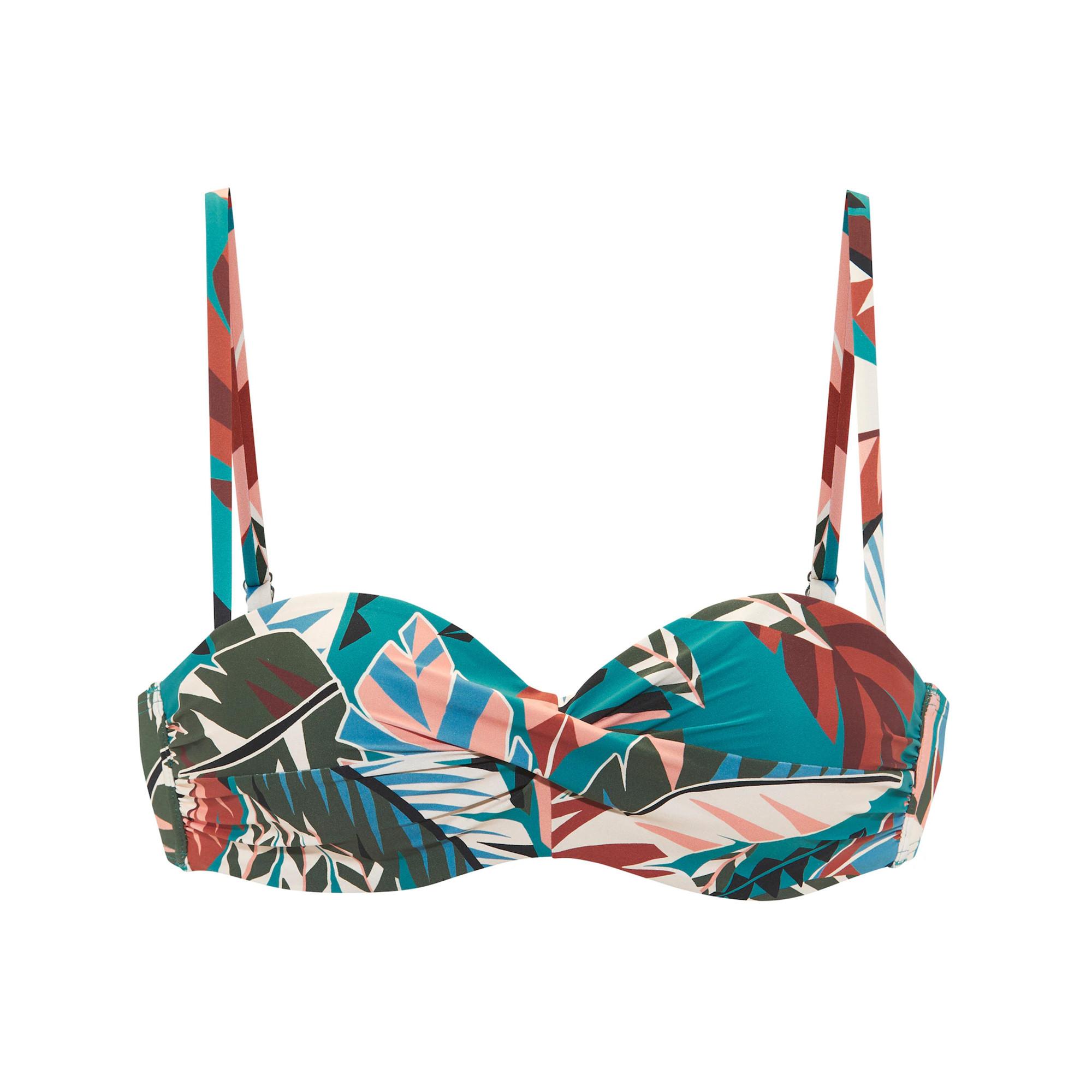 Questo top a fascia presenta un vivace motivo a foglie tropicali, perfetto per un look elegante. Il design include un dettaglio attorcigliato sul davanti e spalline regolabili per una vestibilità comoda e personalizzabile.