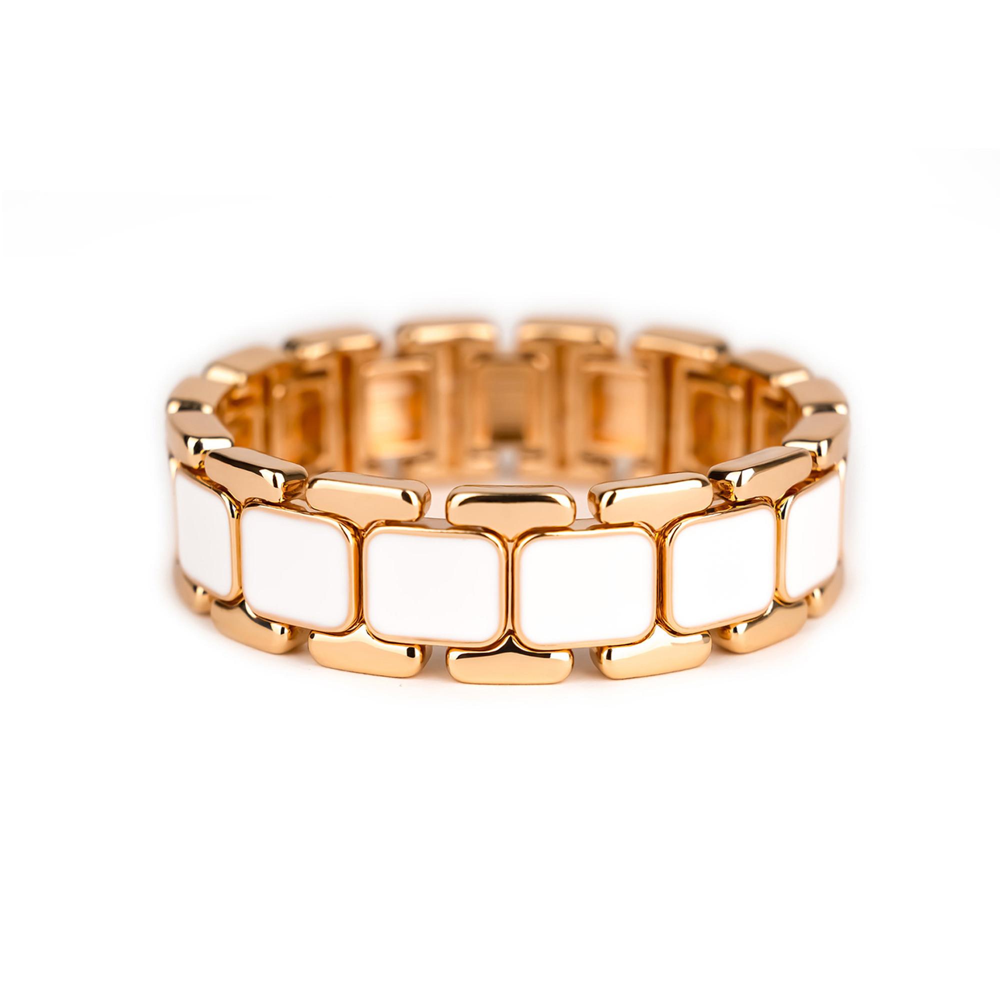 Il bracciale Tempo richiama una piccola siesta primaverile, calma e delicata. Realizzato in metallo smaltato, è caratterizzato da perline rettangolari colorate con finitura dorata, collegate tra loro da eleganti maglie che creano un raffinato incastro lineare. Da indossare come un jonc, è perfetto sia da solo sia abbinato per un effetto manchette. Il cinturino elastico unibrin garantisce comfort e lunga durata.
