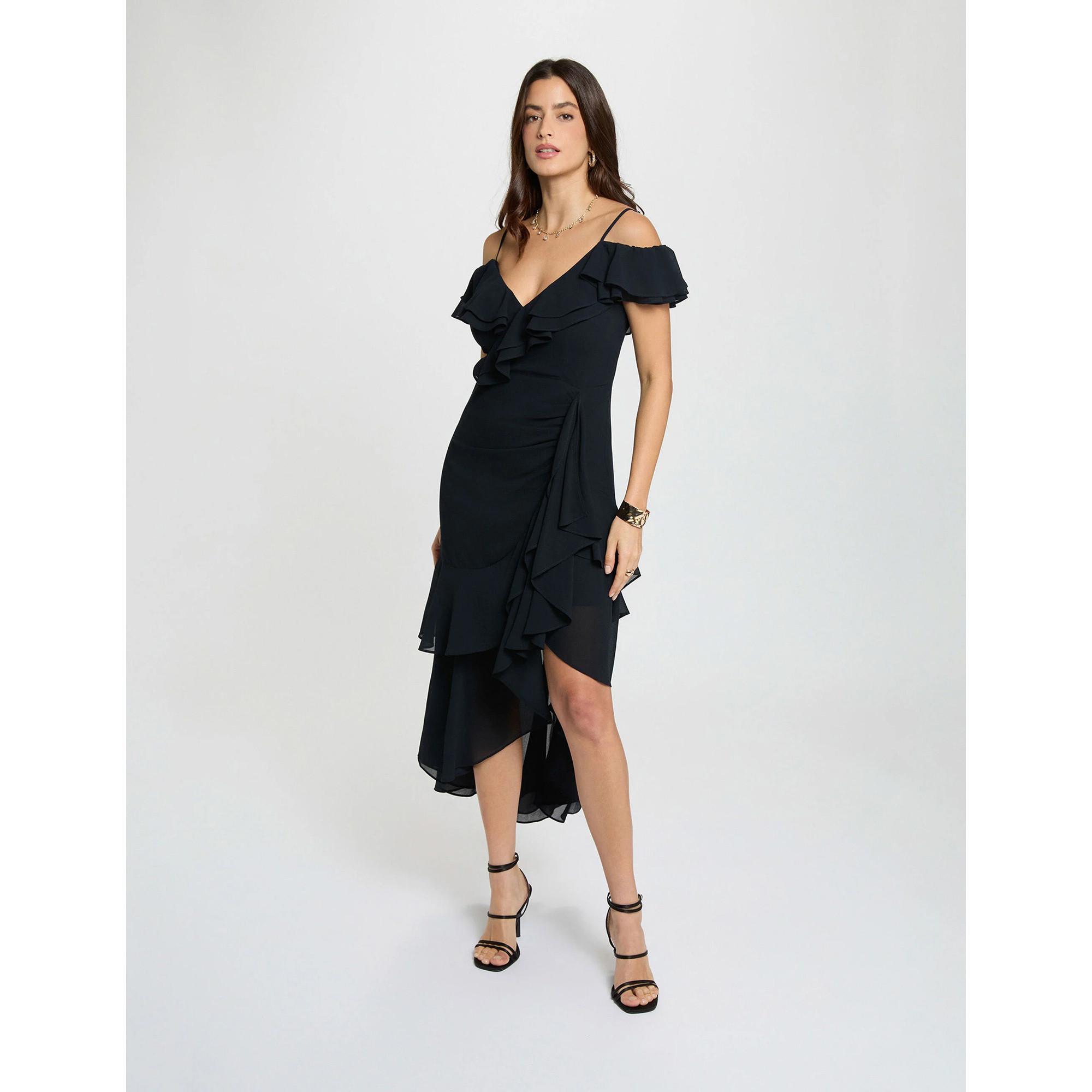 Questo elegante vestito presenta una silhouette lusinghiera con un design a spalle scoperte e delicati volant. Lo scollo a V e le spalline sottili aggiungono un tocco di raffinatezza, mentre l'orlo asimmetrico con una sovrapposizione di volant crea un look dinamico ed elegante. Il vestito è perfetto per occasioni speciali o eventi serali.