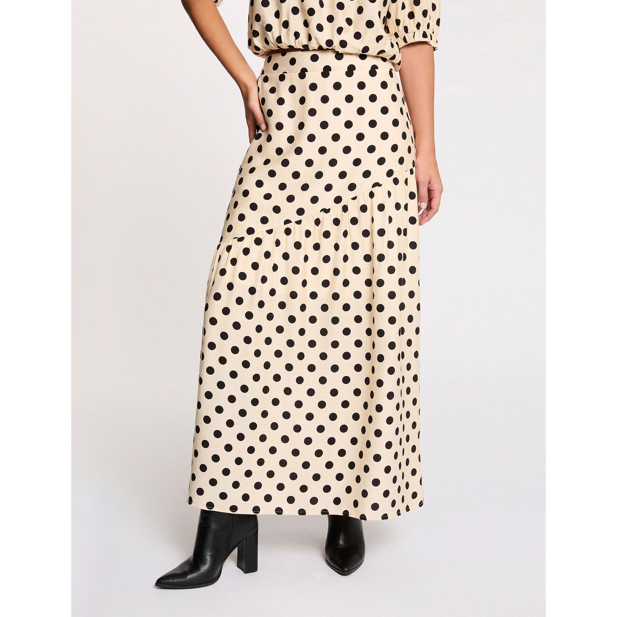 Questa gonna lunga presenta un giocoso motivo a pois, offrendo un'aggiunta elegante e versatile a qualsiasi guardaroba. Il design include un dettaglio a balze a strati, che aggiunge movimento e un tocco di eleganza alla silhouette. La gonna è progettata per essere comoda e alla moda, adatta a varie occasioni.