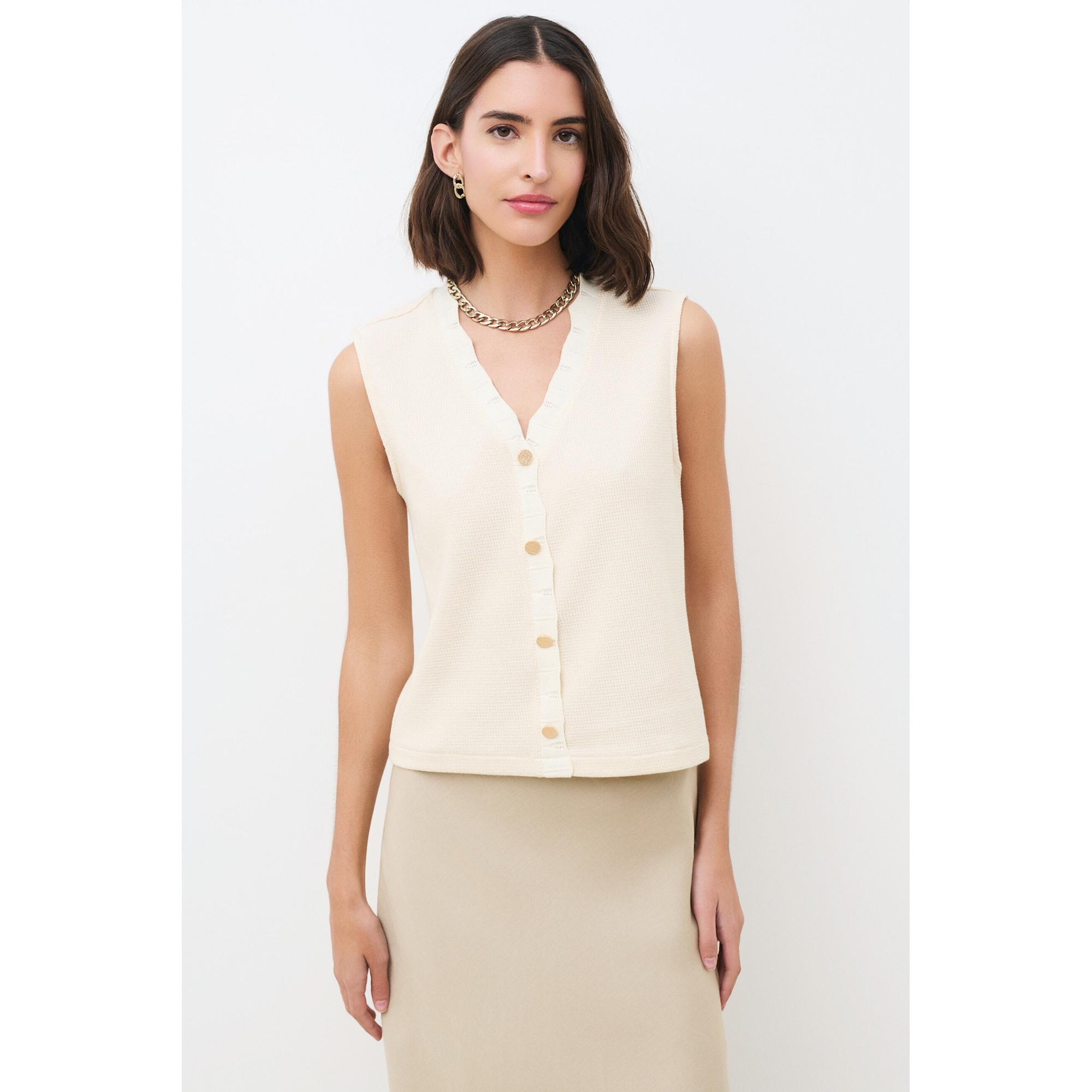 Questo top senza maniche con scollo a V offre un'opzione comoda ed elegante per varie occasioni. La sua lunghezza normale lo rende versatile per l'abbinamento con diversi capi inferiori.