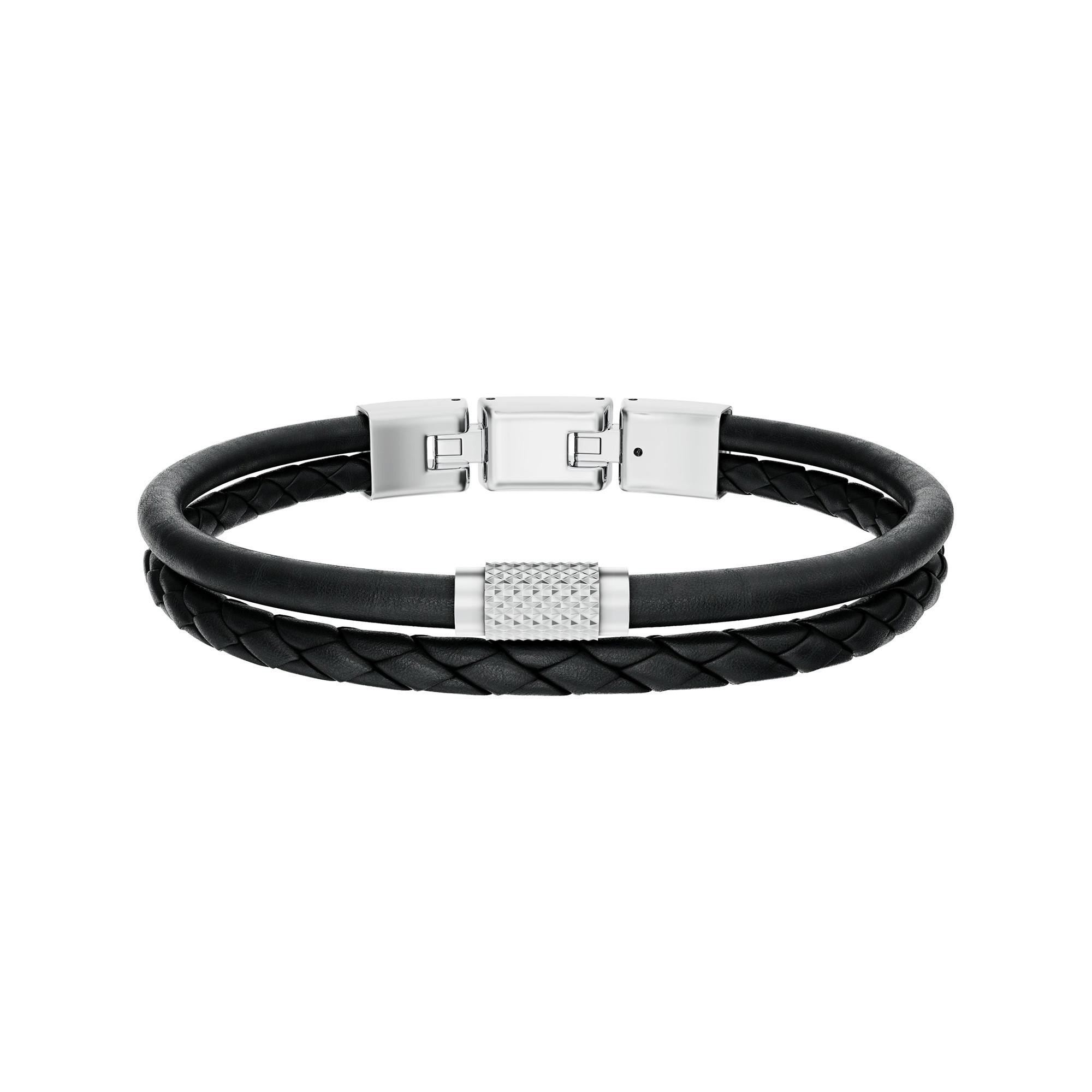 Accenti zigrinati e pelle nera a più fili donano a questo bracciale un look deciso e stratificato. Le superfici lucide e satinate, abbinate a moderni dettagli in acciaio inossidabile, creano profondità ed eleganza. La chiusura deployante garantisce una vestibilità sicura e confortevole. Un accessorio di carattere per uno stile curato e contemporaneo.