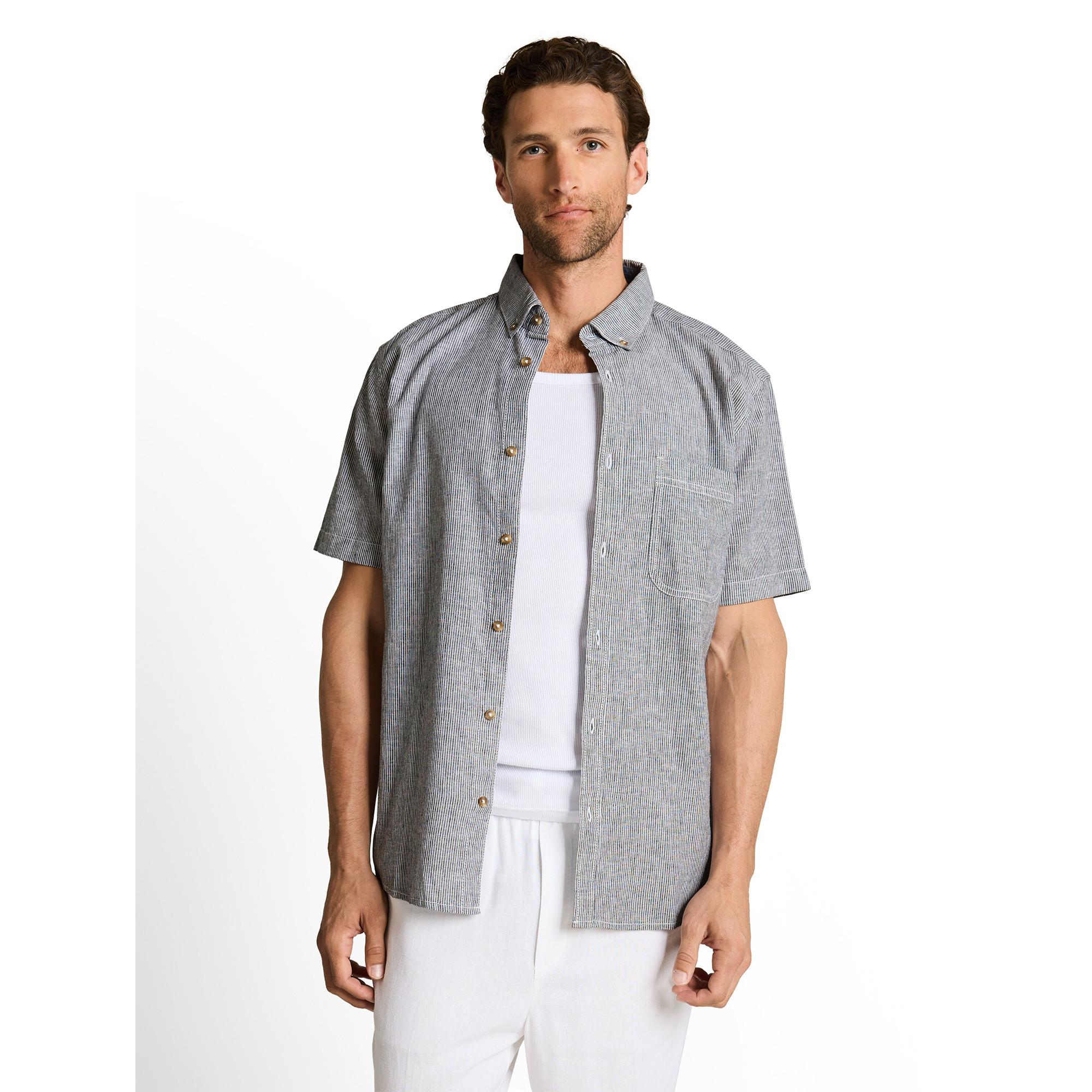 Questa camicia a maniche corte presenta un classico colletto button-down e una tasca sul petto, offrendo un look intramontabile e versatile. Il tessuto azzurro ha un sottile motivo testurizzato, rendendola adatta a varie occasioni casual.