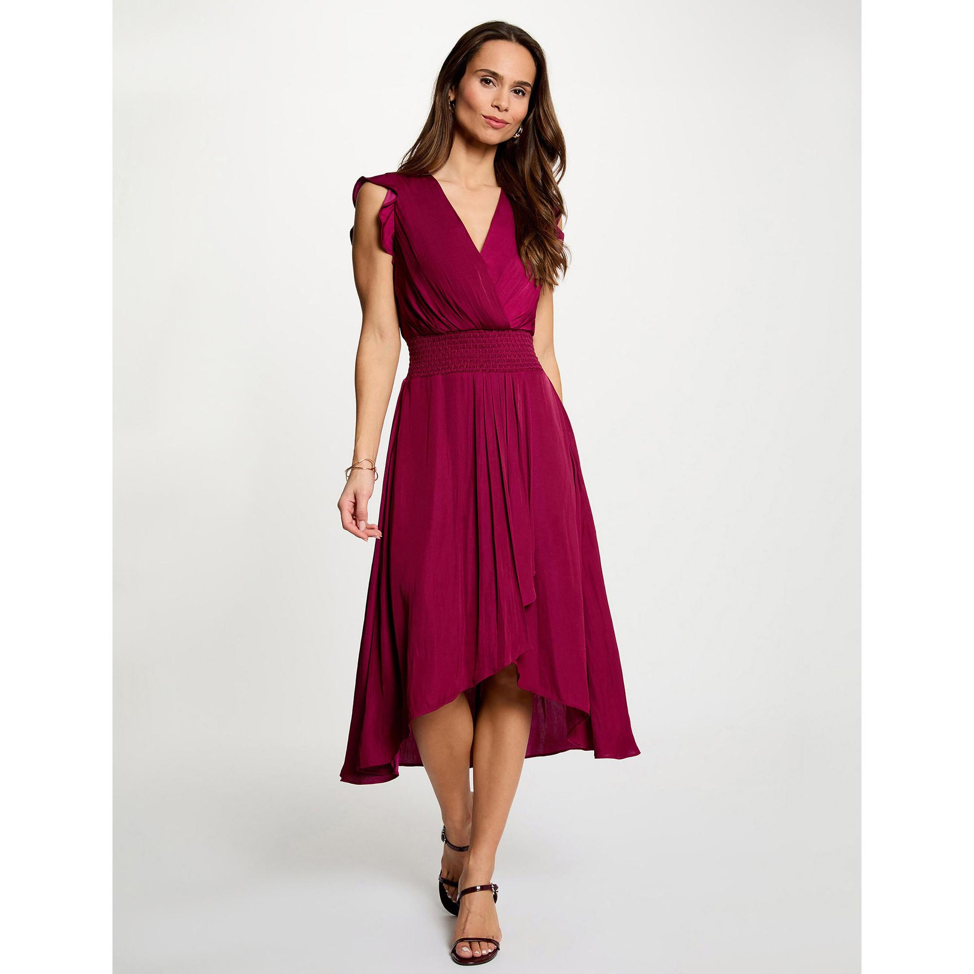 Questo abito elegante presenta uno scollo a V lusinghiero e delicate maniche a volant, creando una silhouette sofisticata. Il design include una vita smockata che accentua la figura, portando a una gonna fluida con un orlo asimmetrico per un tocco moderno.