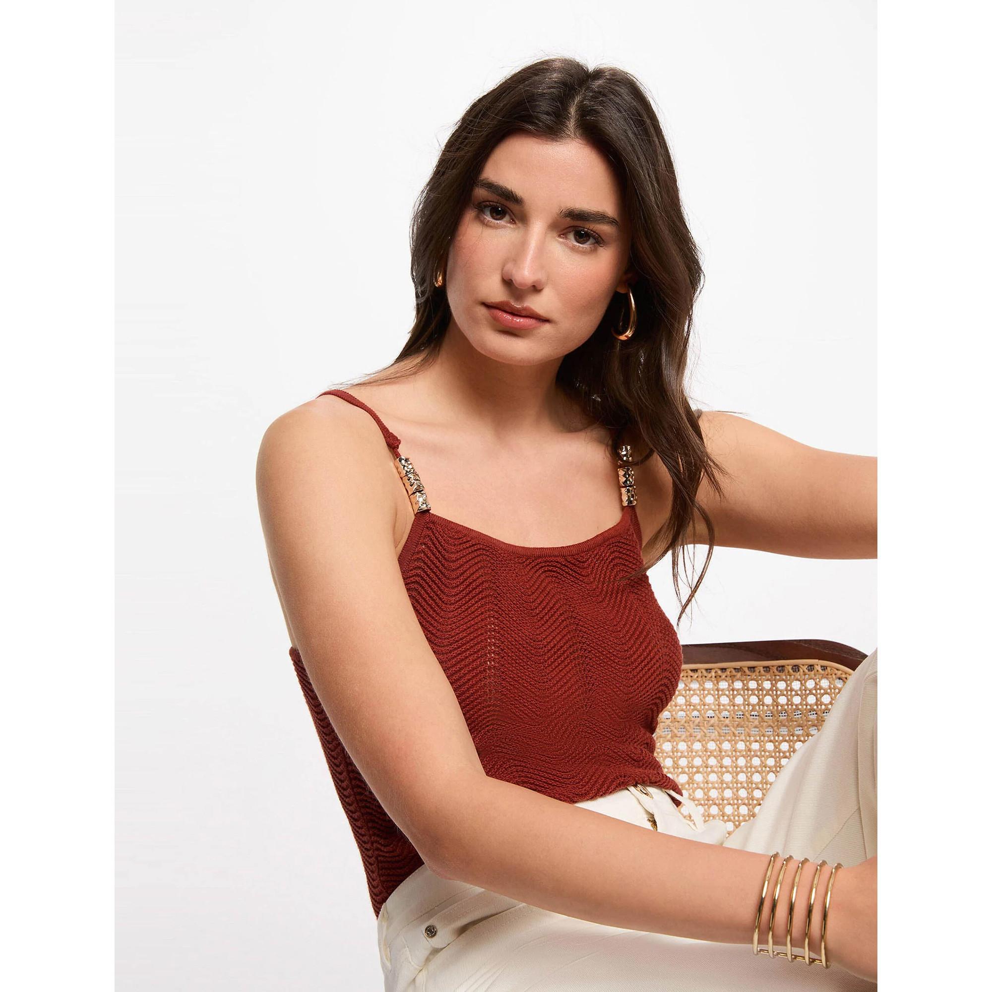 Questo top in maglia aderente di Morgan presenta una scollatura quadrata e una lavorazione fine. Le spalline sottili, regolabili e decorate con dettagli gioiello, aggiungono un tocco femminile ed elegante. Perfetto per le giornate calde o da abbinare a blazer e cardigan.