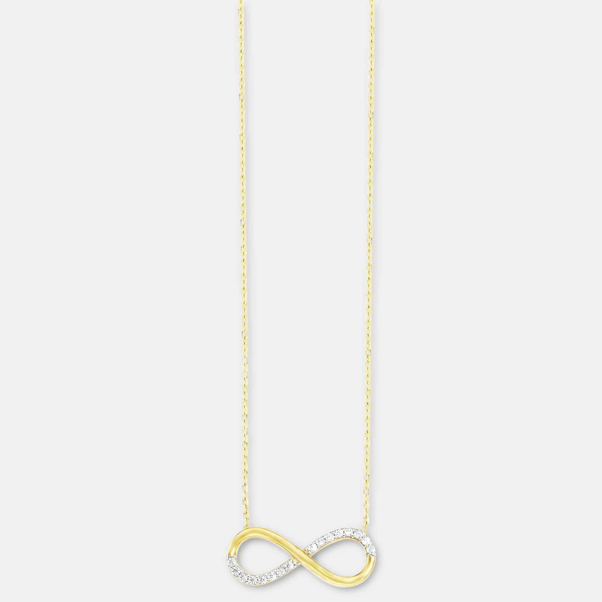 Collana femminile da donna di amor in oro giallo 375 di alta qualità (9 ct). Un grande segno dell'infinito con brillanti zirconi bianchi è integrato nella catena.