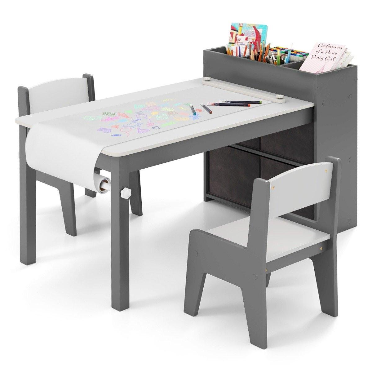 Northix Set da disegno con tavolo e sedie per bambini. Tavolo da disegno con 2 sedie, rotolo di carta e portarotolo. Grigio.