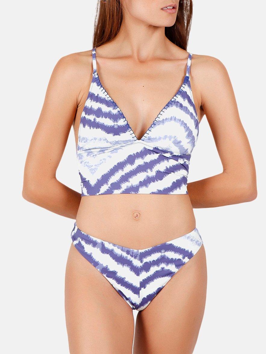 Questo set bikini 2 pezzi preformato Tie And Dye presenta una stampa a righe tie and dye per un look etnico originale. Il top del costume da bagno è un reggiseno senza ferretti con coppe rimovibili per adattarsi al seno. La scollatura a V è rifinita con sottili cuciture smerlate a vista per un tocco ancora più femminile. Sul retro, le spalline sottili si incrociano e si intrecciano e si chiudono con un laccetto in basso. Gli slip a vita bassa sono leggermente rientranti sul retro per mettere in evidenza i glutei, con una leggera forma a V sul davanti. Morbidi, elastici e confortevoli intorno alle gambe. La fodera interna lo rende un costume da bagno molto confortevole e adattabile.