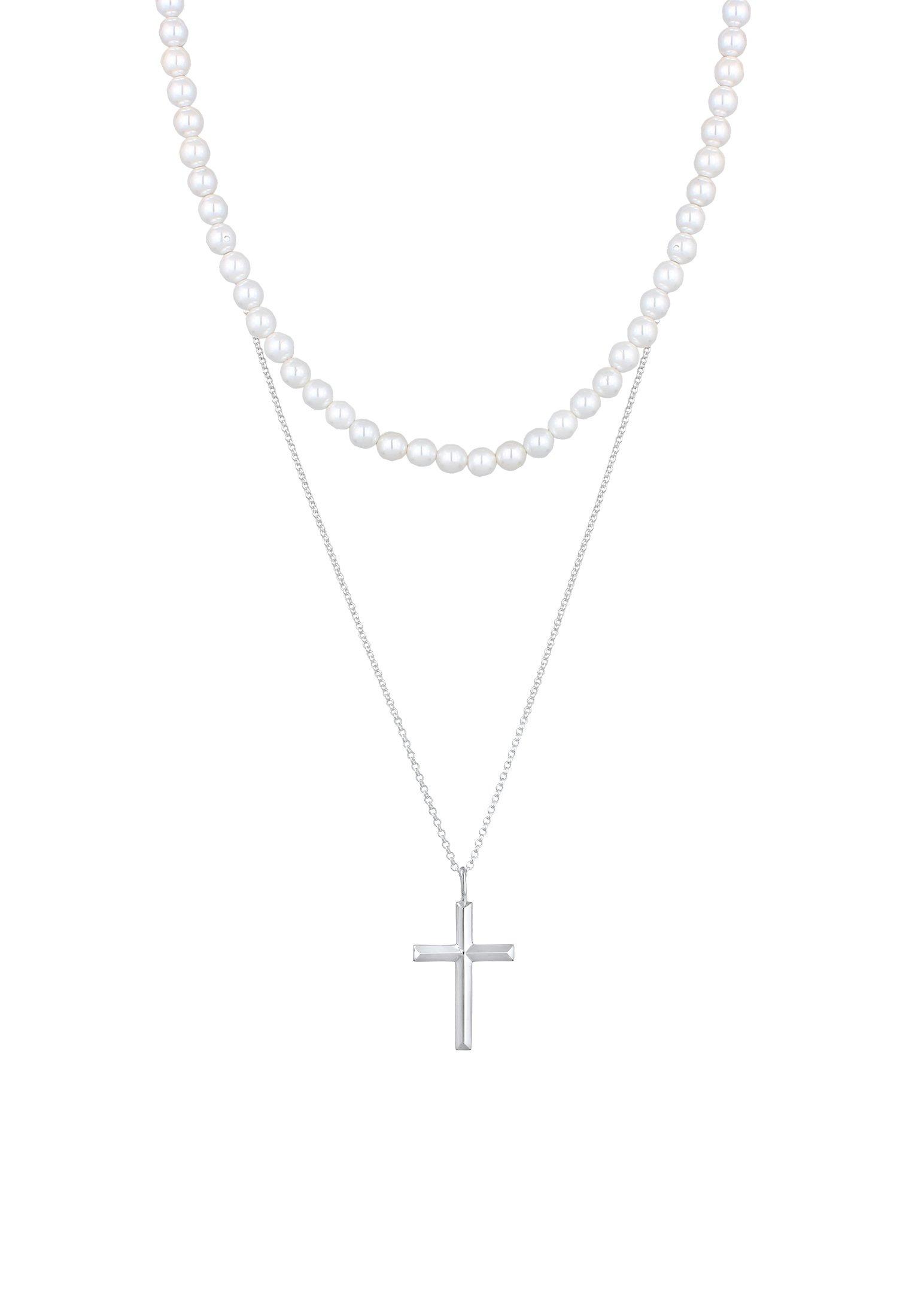 Kuzzoi, Halskette Muschelkernperlen Kreuz Klassik 2Er Set 925 Silber