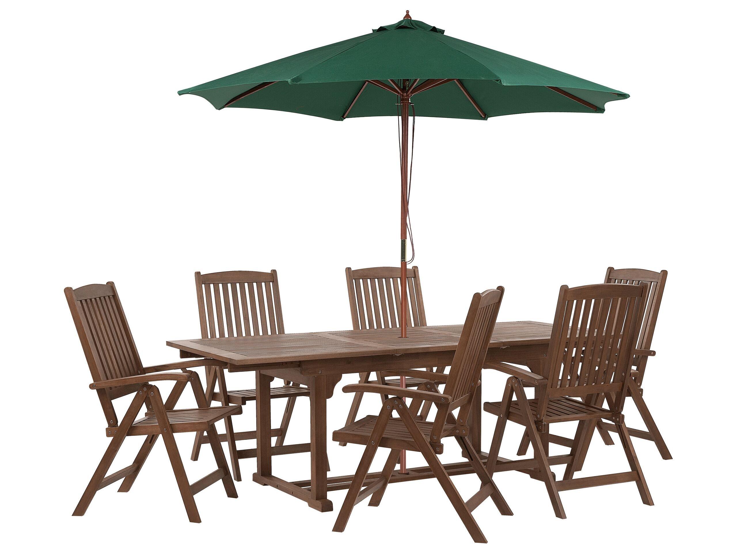 Elegante set da giardino per 6 persone con ombrellone. Prepara il tuo giardino per le giornate calde e trasformalo in un'elegante zona pranzo con questo set , composto da 6 comode sedie e un tavolo allungabile. Tutti i componenti sono realizzati in robusto legno d'acacia di colore scuro, un materiale che si distingue per la sua durata, la naturale resistenza ai raggi UV e la facile manutenzione. Il tavolo può essere allungato, in modo da poter ospitare fino a 8 persone. il set è comprensivo di ombrellone , fornendo una fresca ombra durante le giornate più calde.