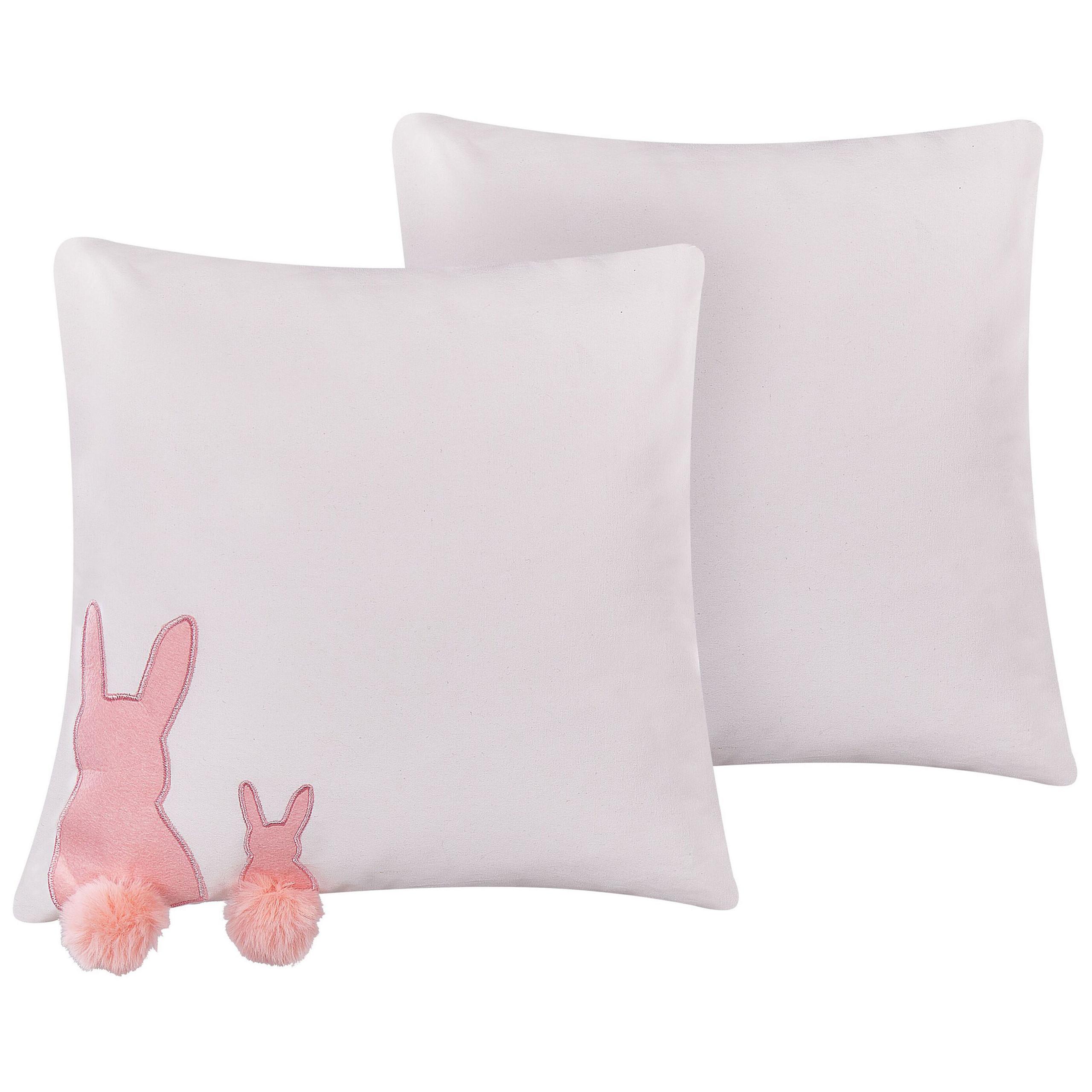 Coppia di cuscini decorativi a motivo pasquale. Trasforma il salotto in una zona confortevole della casa con questo set di 2 cuscini decorativi. È realizzato in soffice cotone di altissima qualità. Il motivo di conigli ricamati con code di pompon cattura l'attenzione.