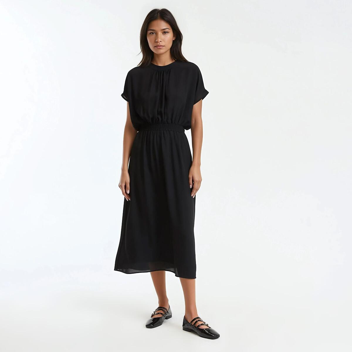 Questo abito lungo presenta eleganti pieghe sotto la scollatura. La vita elasticizzata smock crea una bella silhouette e si adatta perfettamente al corpo. È un capo versatile, ideale per l'uso quotidiano e per le serate fuori.