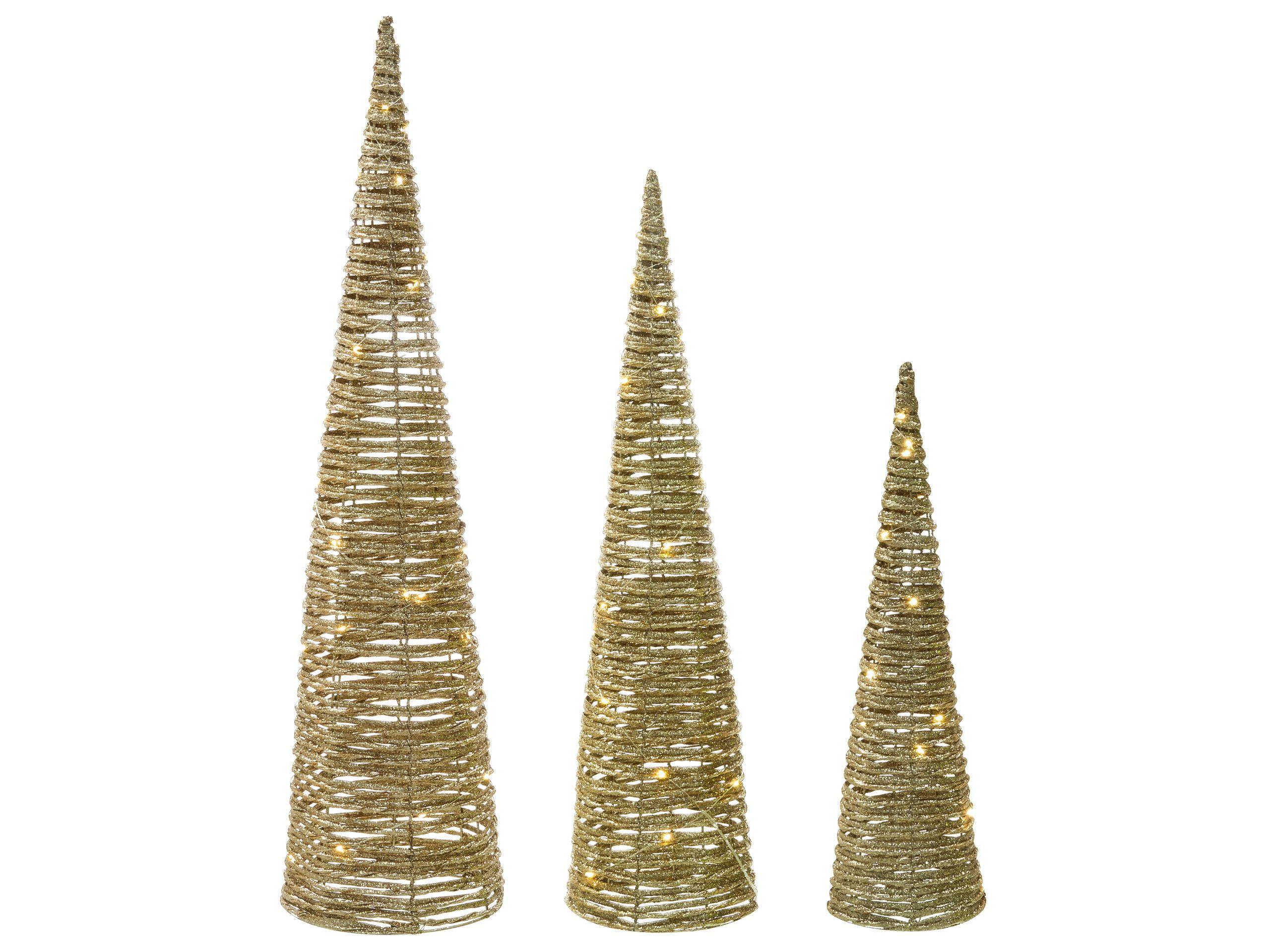 Decorazione LED per albero di Natale da interno. Questo set composto da tre alberi decorativi natalizi con illuminazione LED soffusa è l’ideale per portare un tocco di atmosfera festiva in casa. Realizzati in tonalità calde e in diverse altezze, creano una composizione elegante e di grande effetto. La delicata luce calda diffonde un bagliore accogliente, perfetto per le lunghe serate invernali.
