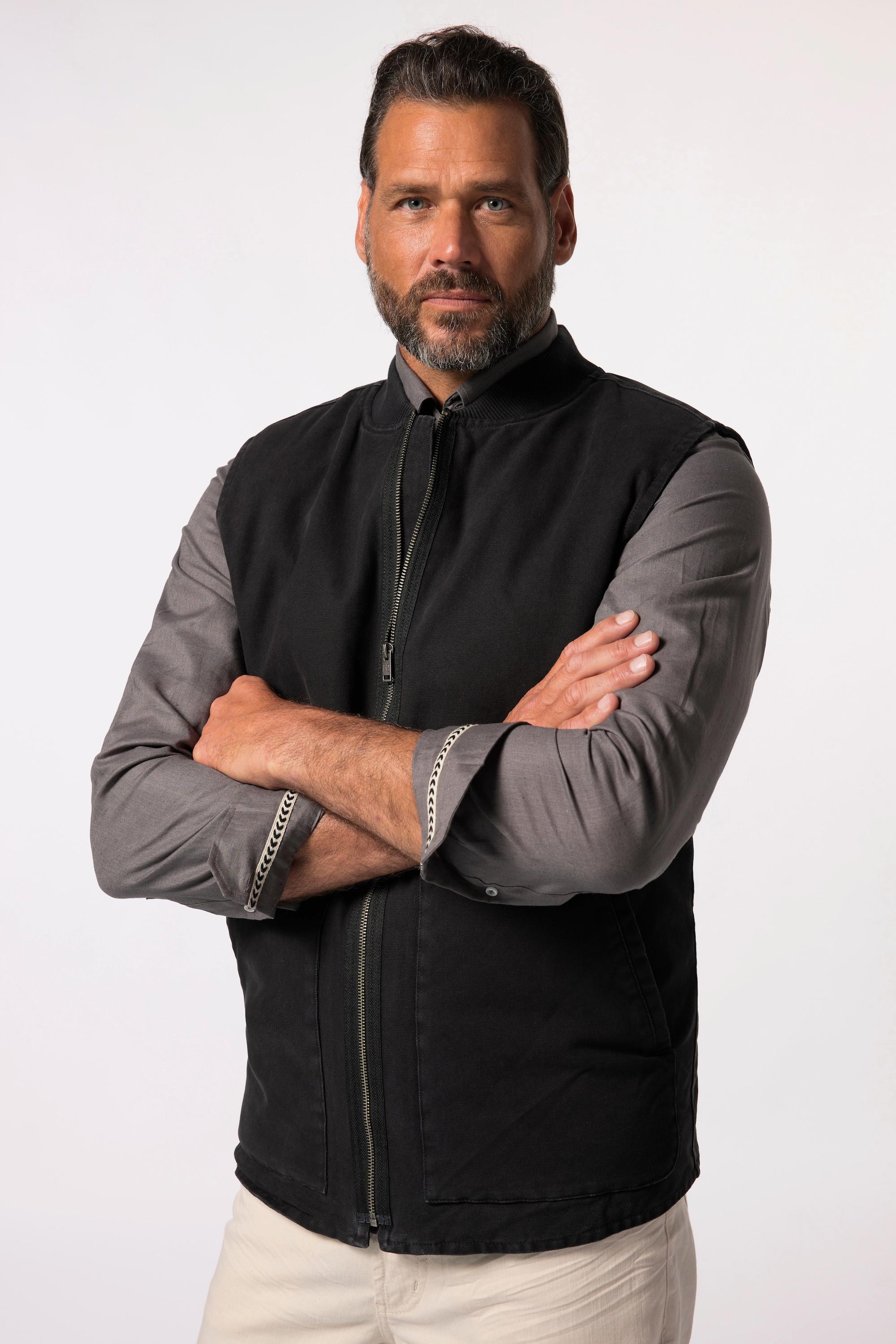Questo gilet in tela presenta un classico colletto stile college, offrendo un'opzione di stratificazione versatile. Il design include una cerniera a tutta lunghezza per una facile vestibilità e pratiche tasche per gli essenziali. È disponibile in un taglio speciale fino alla taglia 8 XL.