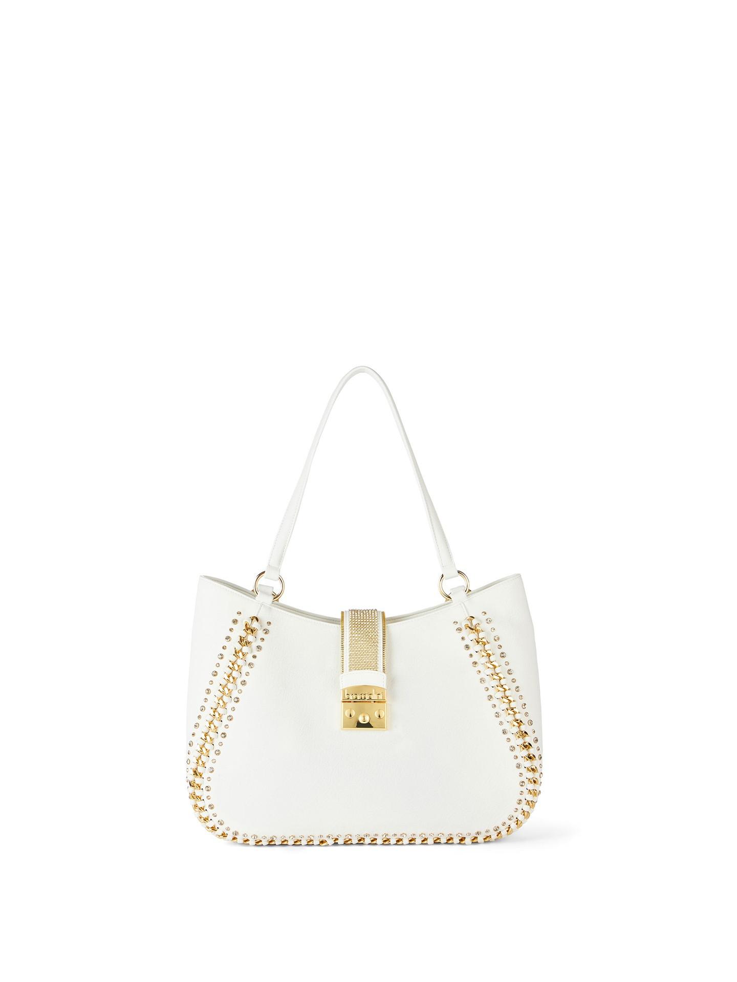 La borsa a tracolla Idalia Plus presenta un design sofisticato con una chiusura a fermaglio sicura. La borsa è impreziosita da catene decorative e borchie lungo i lati, aggiungendo un tocco di glamour alla sua silhouette classica. È un accessorio versatile per varie occasioni.
