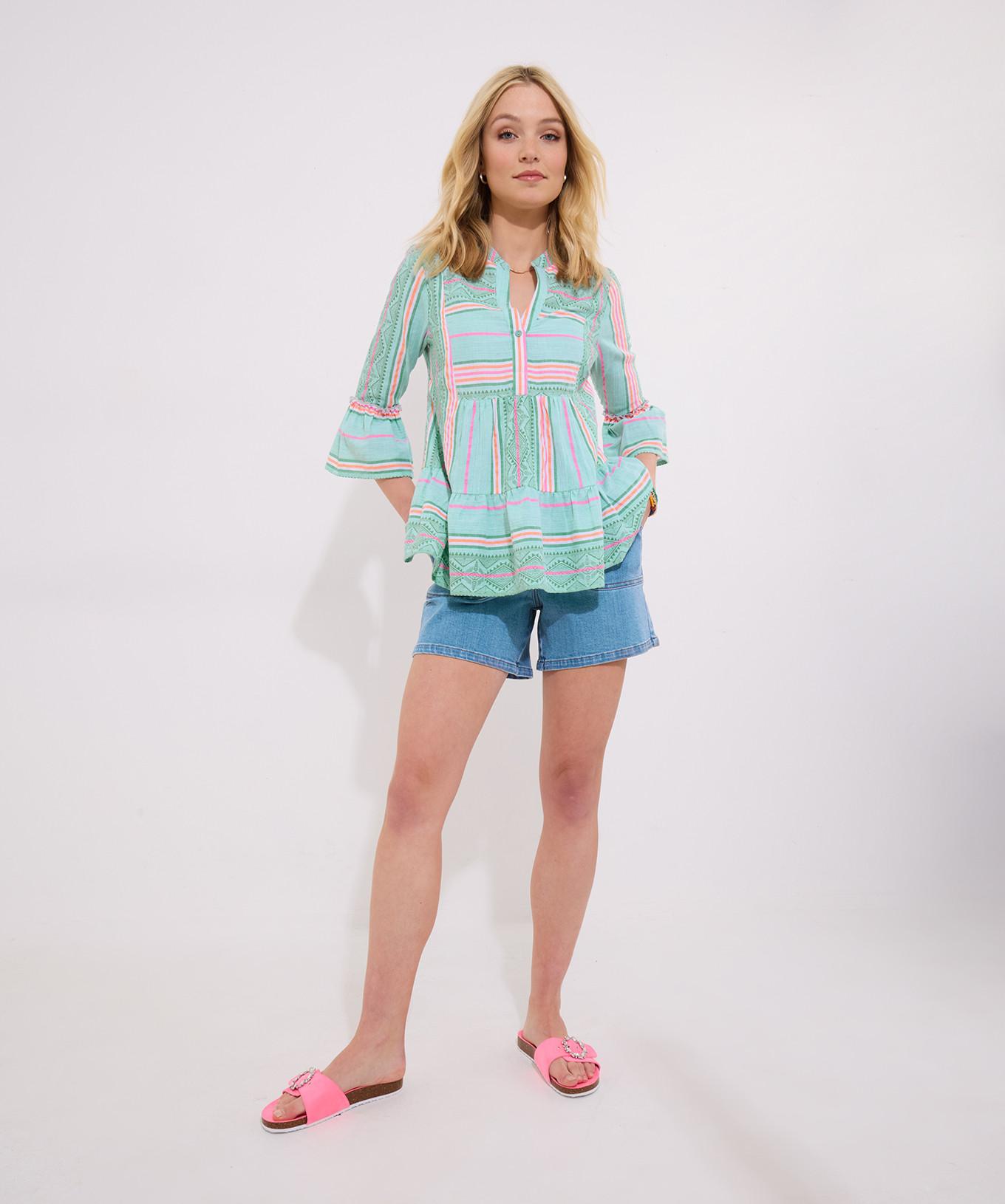 Questa camicetta a righe con scollo a V e vestibilità rilassata è un'aggiunta versatile a qualsiasi guardaroba. Il design include ricami intricati e polsini arricciati, aggiungendo un tocco di fascino bohémien.