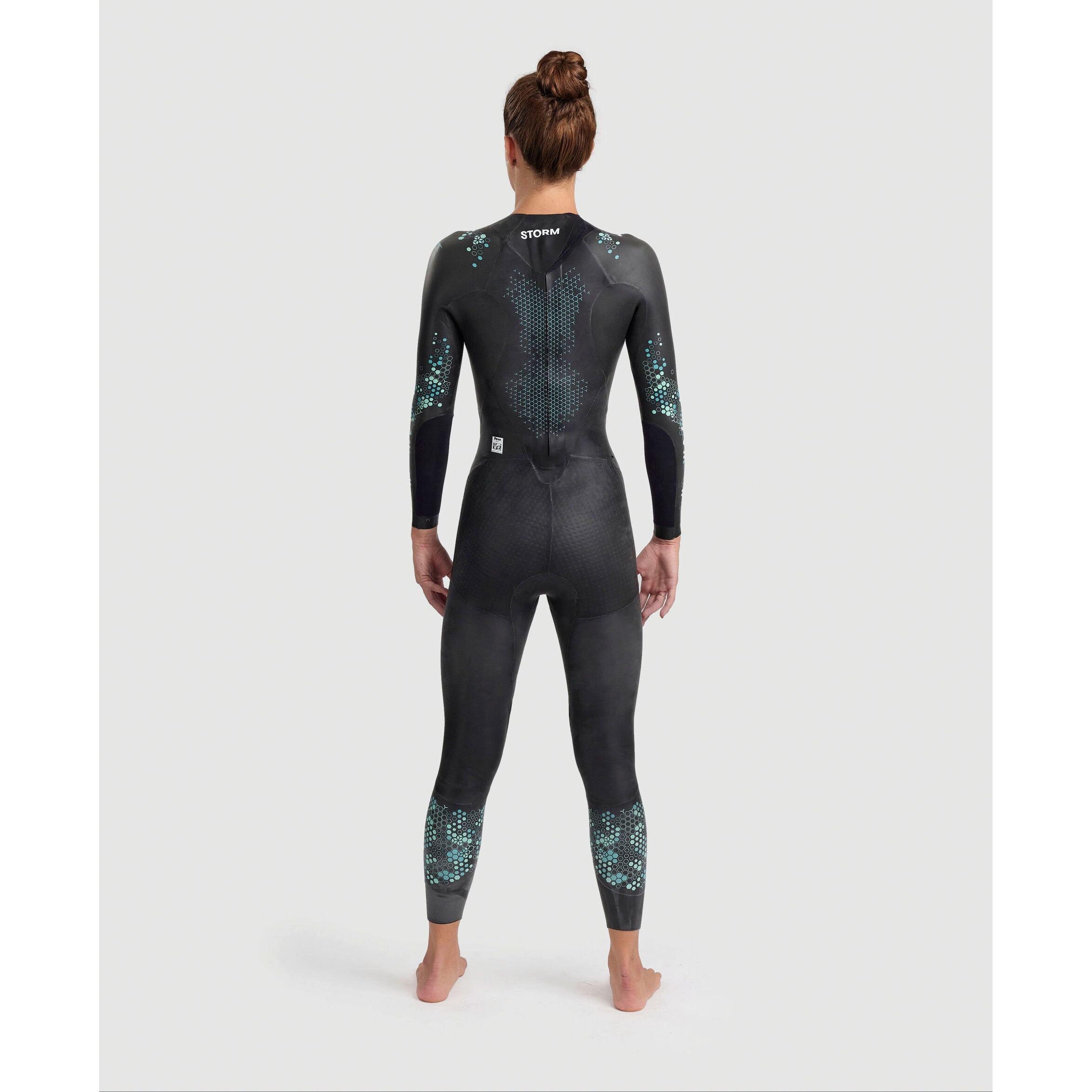 La muta da donna Storm è progettata per prestazioni e comfort ottimali in acqua. Questa elegante muta in neoprene Powerskin è l'ultima versione della popolare muta Carbon ed è il risultato di 50 anni di ricerca sull'idrodinamica. È stata progettata da atleti per atleti, per garantire una perfetta galleggiabilità combinata con il massimo comfort, flessibilità e isolamento termico. La muta Storm è realizzata al 100% in neoprene calcareo Yamamoto SCS, un tipo di neoprene ricavato dal petrolio a ridotto impatto ambientale. I diversi spessori di neoprene garantiscono la massima libertà di movimento durante il nuoto e una galleggiabilità ottimale. La tecnologia in fibra di carbonio incorporata nella muta mantiene il corpo in una posizione ideale in acqua, mentre il nuovo scollo è stato progettato per offrire il massimo comfort e l'assenza di sfregamenti. La speciale costruzione a doppio strato sugli avambracci favorisce una fase di presa più efficiente durante la bracciata e migliora le sensazioni in acqua. Grazie al neoprene più sottile e altamente elastico intorno ai polsi e alle caviglie, la muta può essere indossata e tolta rapidamente. Questa muta da donna è stata approvata per le competizioni FINA, ITU, Ironman e USAT.