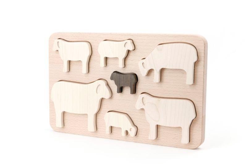 Un beau casse-tête en bois avec une famille de mouton entier. Dimensions: 17 x 24 x 3 cm