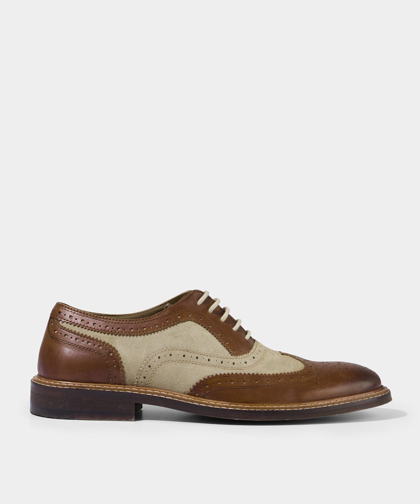 Queste brogues sono realizzate in pelle marrone premium e camoscio color pietra, offrendo una scarpa classica con un tocco moderno. Il design presenta dettagli brogue classici con perforazioni decorative e bordi seghettati, combinando l'artigianato tradizionale con uno stile contemporaneo. Il design bicolore aggiunge un tocco distintivo, rendendole adatte a varie occasioni.