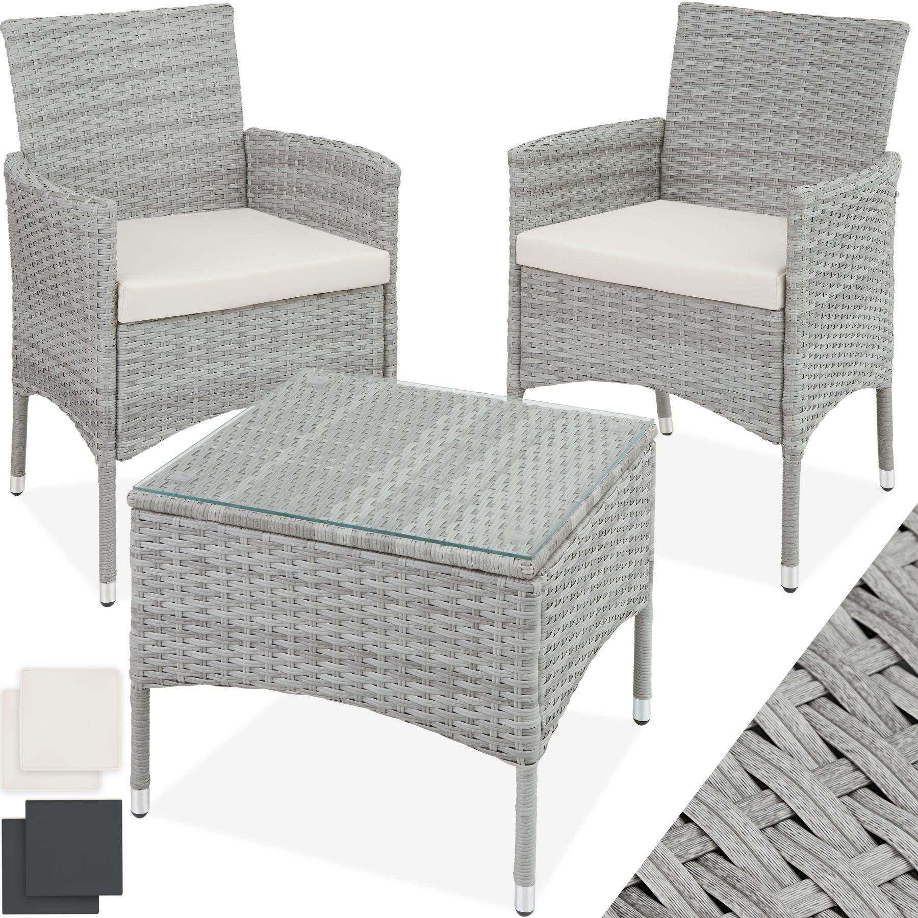 Sul balcone, sulla terrazza o in giardino: con il set in rattan Luzern di tectake, è possibile godersi ottimamente l'estate a casa propria. Grazie alla sua forma compatta, il salottino composto di due sedie e un tavolino con piano in vetro non richiede molto spazio e può essere installato pressoché ovunque. Il suo peso ridotto lo rende ideale per essere trasportato senza problemi. Una volta installato, la sua ponteggi acciaio ne garantisce la massima stabilità. I cuscini dei sedili in poliestere sono perfettamente in tono con la rifinitura in rattan. L'elegante set offre un elevato comfort, unito ad una minima necessità di cura e manutenzione. Per proteggere le imbottiture dallumidità, la superficie è impregnata - sporco e gocce dacqua scivolano così via senza problemi. Rilassatevi, godendovi oggi stesso in tutta tranquillità, il vostro set in rattan Luzern di tectake.