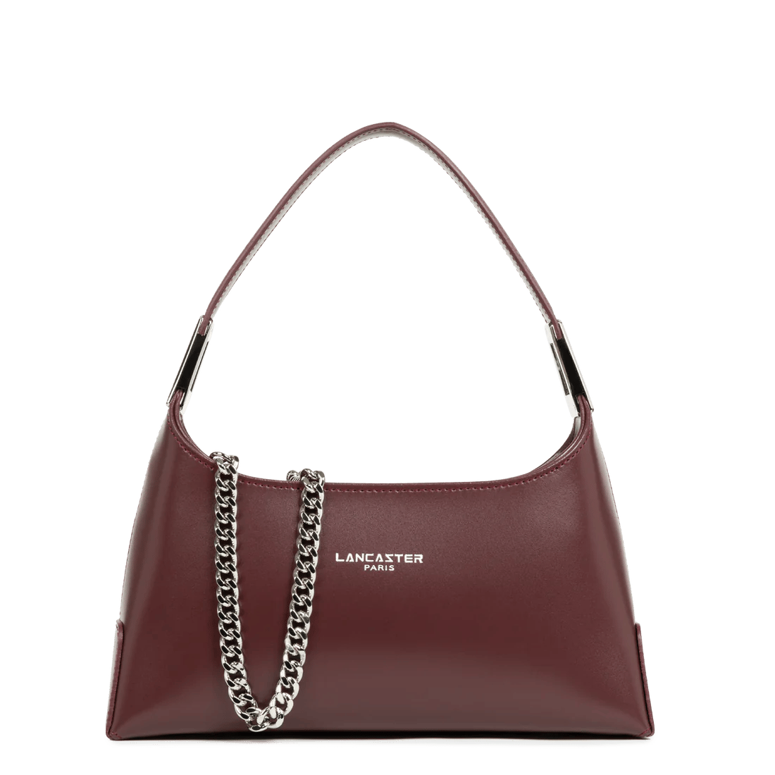 Questa borsa in pelle bordeaux, foderata in tessuto, presenta un design elegante e una forma triangolare. È dotata di manici in pelle per il trasporto a mano o a spalla, oltre a una catena argentata staccabile per il trasporto a tracolla. Le sue dimensioni compatte e gli aspetti funzionali come l'ergonomia, la praticità e la sicurezza la rendono una scelta ideale per eventi formali o professionali.