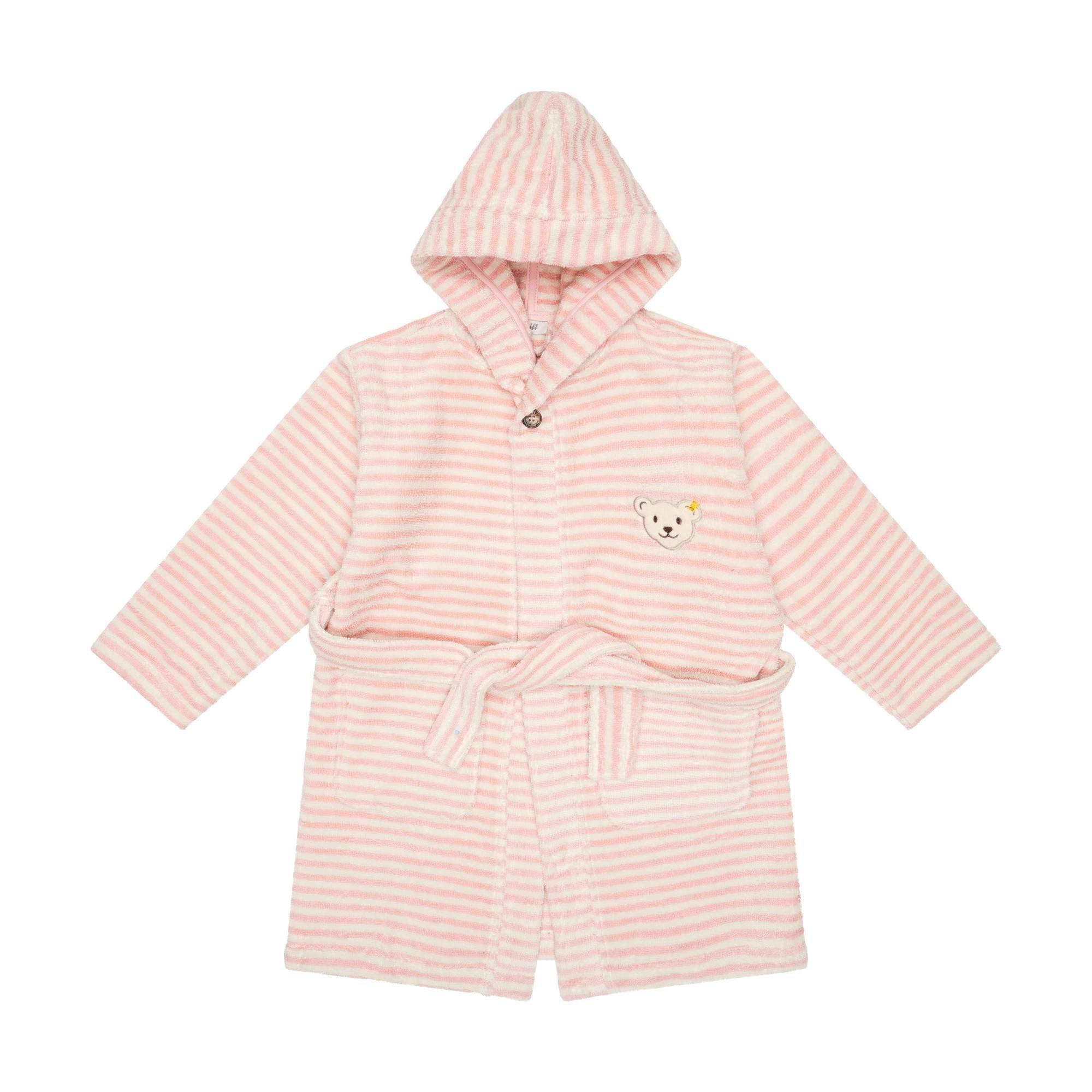 Accappatoio a righe per bambini e bambine del marchio Steiff. Morbido accappatoio con cappuccio e due tasche sul davanti. La cintura da annodare assicura una vestibilità perfetta. Motivo di un piccolo orsetto sul petto a sinistra. Comodo da indossare grazie al puro cotone.