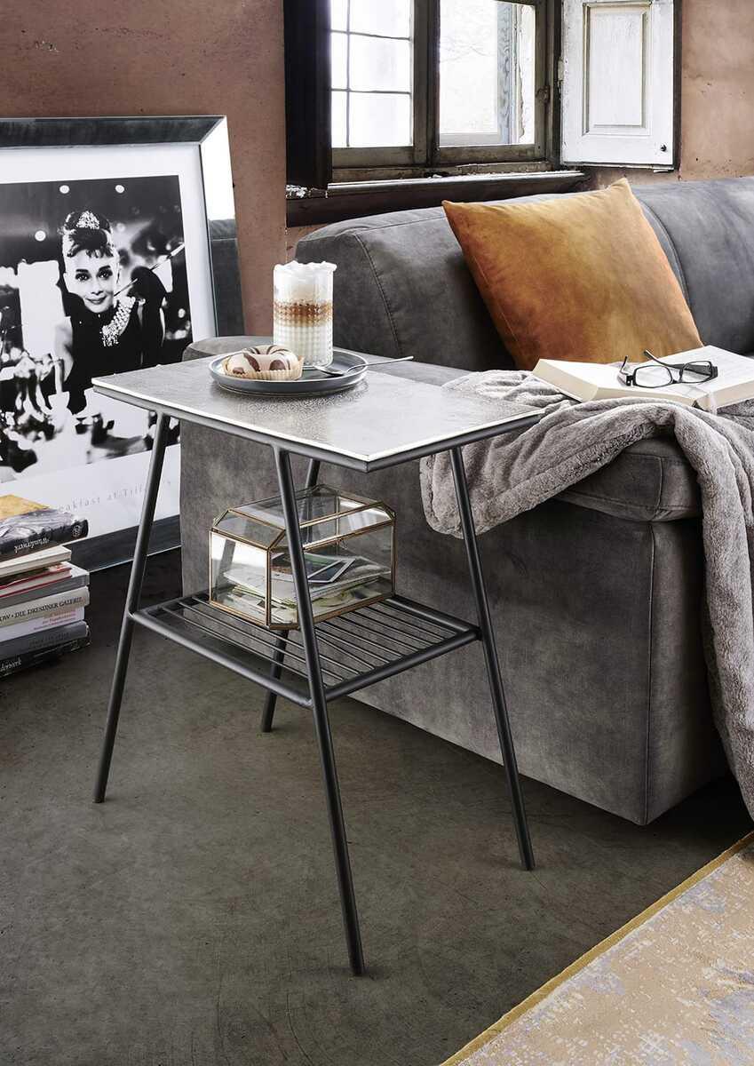 Tavolino VictoryLarghezza x altezza x profondità: circa 52x60x30cmPiano: alluminio nichelato argentoStruttura: metallo nero opaco