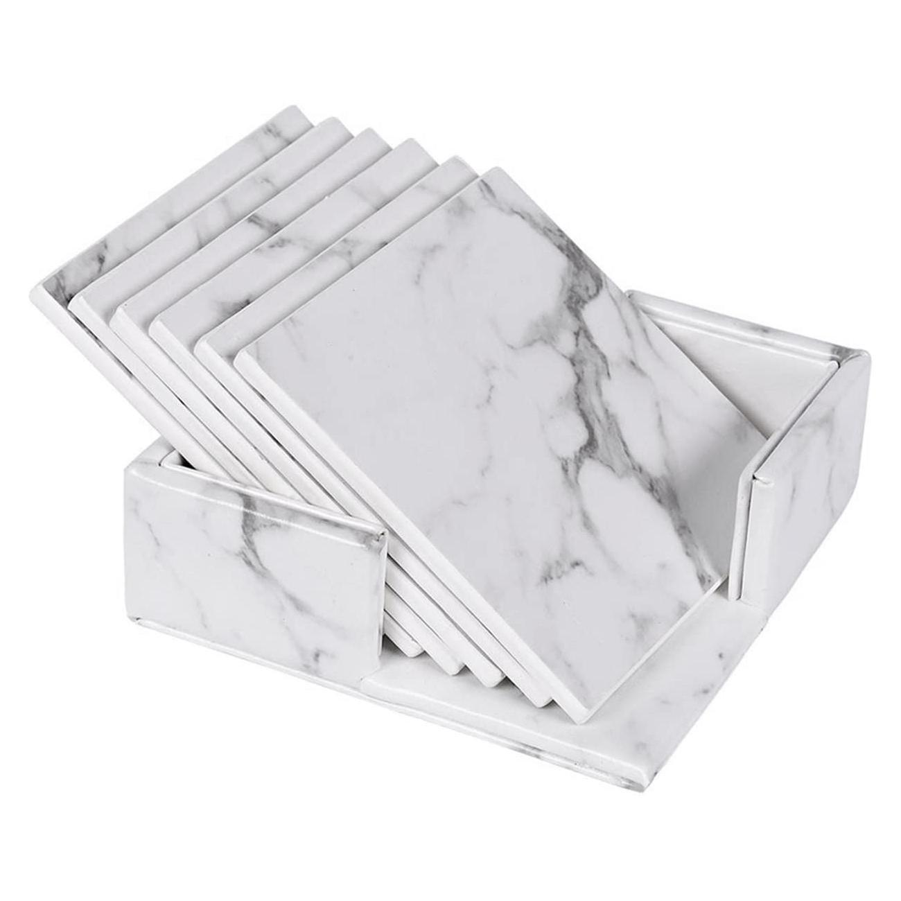 Con i sottobicchieri eviti brutti aloni sul tavolo da caffè e tazze da tè. Questi eleganti sottobicchieri sono anche una bella aggiunta all'arredamento della casa. I sottobicchieri sono realizzati in pelle PU con un design ispirato al marmo e sono dotati di un supporto in un design abbinato. Il materiale morbido consente inoltre di evitare rumori indesiderati di vetro e ceramica che colpiscono il tavolo.